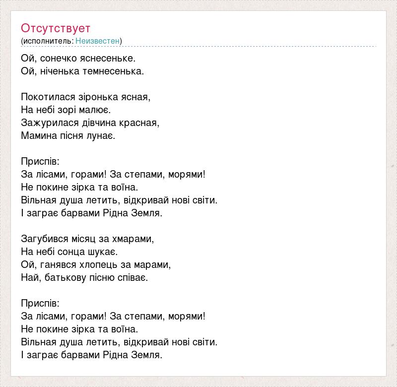 Ой, сонечко яснесеньке. Ой, нiченька темнесенька. Покотилася зіронька ясная, На небі зорі малює. Зажурилася дiвчина красная, Мамина пiсня лунає. Приспiв: За лісами, горами! За степами, морями! Не покине зірка та воїна. Вiльная душа летить, вiдкривай новi свiти. I заграє барвами Рiдна Земля. Загубився мiсяц за хмарами, На небi сонца шукає. Ой, ганявся хлопець за марами, Най, батькову пiсню спiває. Приспiв: За лісами, горами! За степами, морями! Не покине зірка та воїна. Вiльная душа летить, вiдкривай новi свiти. I заграє барвами Рiдна Земля.