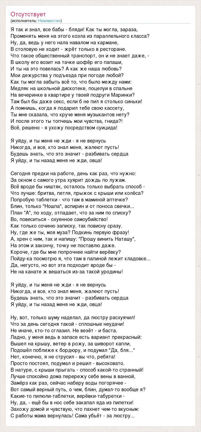 Я так и знал, все бабы - бляди! Как ты могла, зараза, Променять меня на этого козла из параллельного класса? Ну, да, ведь у него нала навалом на кармане, В столовую не ходит - жрёт только в ресторане. Что такое общественный транспорт, он и не знает даже, - В школу его возит на тачке шофёр его папаши, И ты на это повелась? А как же наша любовь? Мои дежурства у подъезда при погоде любой? Как ты могла забыть всё то, что было между нами: Медляк на школьной дискотеке, поцелуи в спальне На вечеринке в квартире у твоей подруги Маринки? Там был бы даже секс, если б не пил я столько синьки! А помнишь, когда я подарил тебе свою кассету, Ты мне сказала, что круче меня музыкантов нету? И после этого ты топчешь мои чувства, гнида?! Всё, решено - я ухожу посредством суицида! Я уйду, и ты меня не жди - я не вернусь Никогда, и все, кто знал меня, жалеют пусть! Будешь знать, что это значит - разбивать сердца Я уйду, и ты назад меня не жди, овца! Сегодня предки на работе, день как раз, что нужно: За окном с самого утра хуярит дождь по лужам. Всё вроде бы ништяк, осталось только выбрать способ - Что лучше: бритва, петля, прыжок с крыши или колёса? Попробую таблетки - что там в маминой аптечке? Блин, только "Ношпа", аспирин и от поноса свечки... План "А", по ходу, отпадает, что за ним по списку? Во, повеситься - охуенное самоубийство! Как только сочиню записку, так повисну сразу. Ну, где же ты, моя муза? Подкинь первую фразу! А, хрен с ним, так и напишу: "Прошу винить Наташу", На этом и закончу, точку не поставлю даже. Короче, где бы мне попрочнее найти верёвку? Пойду-ка посмотрю я, что там в папиной лежит кладовке... Да, негусто, но вот эта подходит вроде бы - Не на канате ж вешаться из-за такой уродины! Я уйду, и ты меня не жди - я не вернусь Никогда, и все, кто знал меня, жалеют пусть! Будешь знать, что это значит - разбивать сердца Я уйду, и ты назад меня не жди, овца! Ну, вот, только шуму наделал, да люстру расхуячил! Что за день сегодня такой - сплошные неудачи! Не иначе, кто-то сглазил. Не везёт - и баста. Ладно, у меня ведь в запасе есть вариант прекрасный: Вышел на крышу, ветер в рожу, за шиворот капли, Подошёл поближе к бордюру, и подумал "Да, бля..." Нет, конечно, я не струсил - вы что, ребята! Просто постоял, подумал и решил - высоковато. В натуре, с крыши прыгать - способ какой-то странный! Лучше спокойно дома перережу себе вены в ванной, Замёрз как раз, сейчас наберу воды погорячее - Вот самый верный путь, о чем, блин, думал-то вообще я? Какие-то пилюли-таблетки, верёвки-табуретки - Ну, да, - ещё бы в нос себе закапал яда из пипетки! Захожу домой и чувствую, что пахнет чем-то вкусным: С работы мама вернулась! Сама убьёт - за люстру...