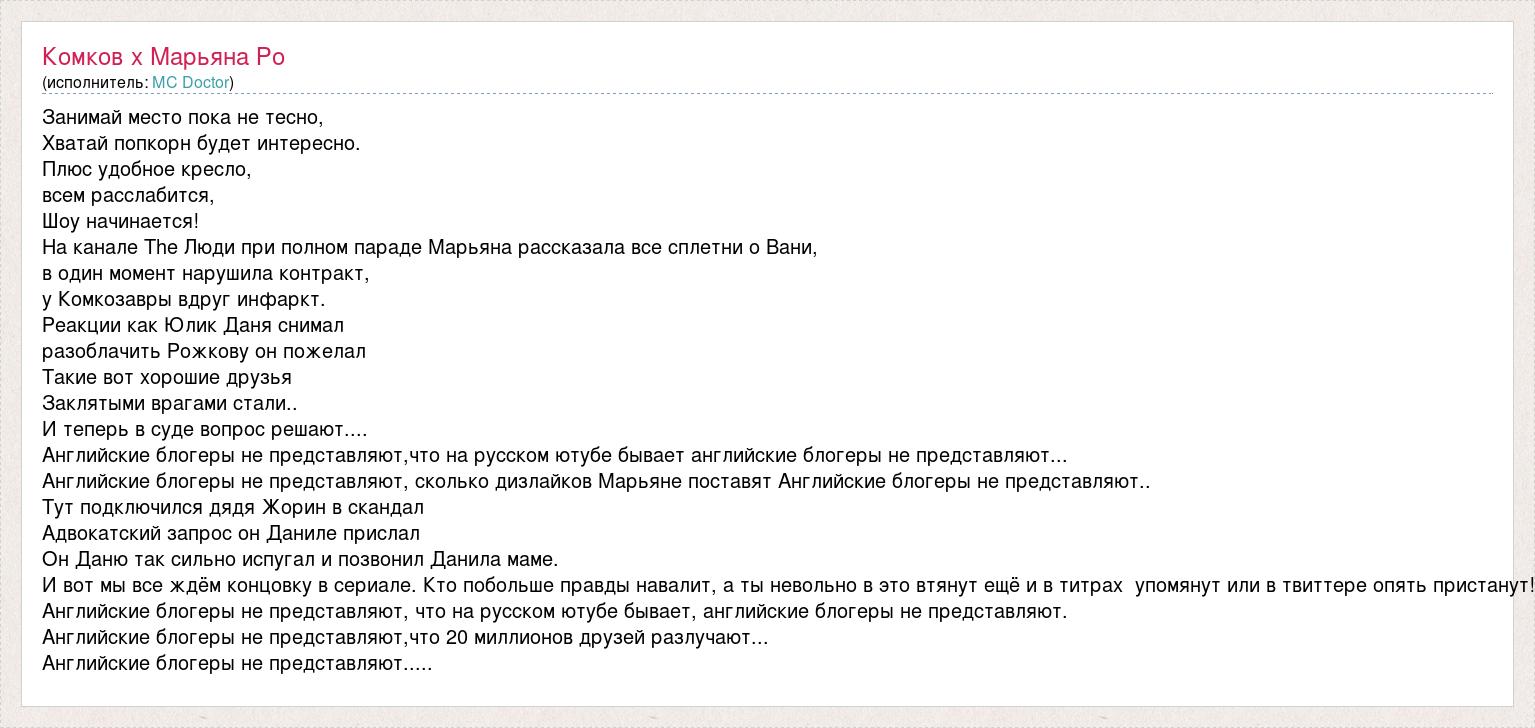 Занимай место пока не тесно, Хватай попкорн будет интересно. Плюс удобное кресло, всем расслабится, Шоу начинается! На канале The Люди при полном параде Марьяна рассказала все сплетни о Вани, в один момент нарушила контракт, у Комкозавры вдруг инфаркт. Реакции как Юлик Даня снимал разоблачить Рожкову он пожелал Такие вот хорошие друзья Заклятыми врагами стали.. И теперь в суде вопрос решают.... Английские блогеры не представляют,что на русском ютубе бывает английские блогеры не представляют... Английские блогеры не представляют, сколько дизлайков Марьяне поставят Английские блогеры не представляют.. Тут подключился дядя Жорин в скандал Адвокатский запрос он Даниле прислал Он Даню так сильно испугал и позвонил Данила маме. И вот мы все ждём концовку в сериале. Кто побольше правды навалит, а ты невольно в это втянут ещё и в титрах упомянут или в твиттере опять пристанут! Английские блогеры не представляют, что на русском ютубе бывает, английские блогеры не представляют. Английские блогеры не представляют,что 20 миллионов друзей разлучают... Английские блогеры не представляют.....