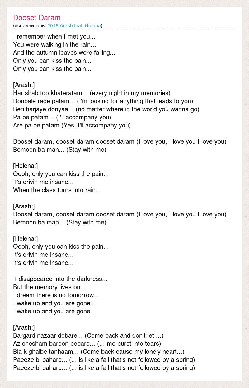I remember when I met you... You were walking in the rain... And the autumn leaves were falling... Only you can kiss the pain... Only you can kiss the pain... [Arash:] Har shab too khateratam... (every night in my memories) Donbale rade patam... (I'm looking for anything that leads to you) Beri harjaye donyaa... (no matter where in the world you wanna go) Pa be patam... (I'll accompany you) Are pa be patam (Yes, I'll accompany you) Dooset daram, dooset daram dooset daram (I love you, I love you I love you) Bemoon ba man... (Stay with me) [Helena:] Oooh, only you can kiss the pain... It's drivin me insane... When the class turns into rain... [Arash:] Dooset daram, dooset daram dooset daram (I love you, I love you I love you) Bemoon ba man... (Stay with me) [Helena:] Oooh, only you can kiss the pain... It's drivin me insane... It's drivin me insane... It disappeared into the darkness... But the memory lives on... I dream there is no tomorrow... I wake up and you are gone... I wake up and you are gone... [Arash:] Bargard nazaar dobare... (Come back and don't let ...) Az chesham baroon bebare... (... me burst into tears) Bia k ghalbe tanhaam... (Come back cause my lonely heart...) Paeeze bi bahare... (... is like a fall that's not followed by a spring) Paeeze bi bahare... (... is like a fall that's not followed by a spring)