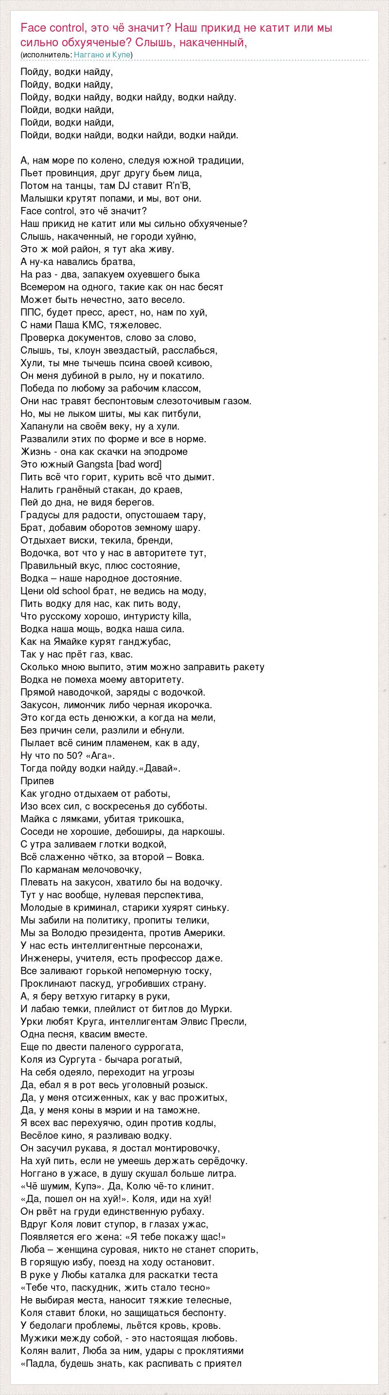 Пойду, водки найду, Пойду, водки найду, Пойду, водки найду, водки найду, водки найду. Пойди, водки найди, Пойди, водки найди, Пойди, водки найди, водки найди, водки найди. А, нам море по колено, следуя южной традиции, Пьет провинция, друг другу бьем лица, Потом на танцы, там DJ ставит R’n’B, Малышки крутят попами, и мы, вот они. Face control, это чё значит? Наш прикид не катит или мы сильно обхуяченые? Слышь, накаченный, не городи хуйню, Это ж мой район, я тут aka живу. А ну-ка навались братва, На раз - два, запакуем охуевшего быка Всемером на одного, такие как он нас бесят Может быть нечестно, зато весело. ППС, будет пресс, арест, но, нам по хуй, С нами Паша КМС, тяжеловес. Проверка документов, слово за слово, Слышь, ты, клоун звездастый, расслабься, Хули, ты мне тычешь псина своей ксивою, Он меня дубиной в рыло, ну и покатило. Победа по любому за рабочим классом, Они нас травят беспонтовым слезоточивым газом. Но, мы не лыком шиты, мы как питбули, Хапанули на своём веку, ну а хули. Развалили этих по форме и все в норме. Жизнь - она как скачки на эподроме Это южный Gangsta [bad word] Пить всё что горит, курить всё что дымит. Налить гранёный стакан, до краев, Пей до дна, не видя берегов. Градусы для радости, опустошаем тару, Брат, добавим оборотов земному шару. Отдыхает виски, текила, бренди, Водочка, вот что у нас в авторитете тут, Правильный вкус, плюс состояние, Водка – наше народное достояние. Цени old school брат, не ведись на моду, Пить водку для нас, как пить воду, Что русскому хорошо, интуристу killa, Водка наша мощь, водка наша сила. Как на Ямайке курят ганджубас, Так у нас прёт газ, квас. Сколько мною выпито, этим можно заправить ракету Водка не помеха моему авторитету. Прямой наводочкой, заряды с водочкой. Закусон, лимончик либо черная икорочка. Это когда есть денюжки, а когда на мели, Без причин сели, разлили и ебнули. Пылает всё синим пламенем, как в аду, Ну что по 50? «Ага». Тогда пойду водки найду.«Давай». Припев Как угодно отдыхаем от работы, Изо всех сил, с воскресенья до субботы. Майка с лямками, убитая трикошка, Соседи не хорошие, дебоширы, да наркошы. С утра заливаем глотки водкой, Всё слаженно чётко, за второй – Вовка. По карманам мелочовочку, Плевать на закусон, хватило бы на водочку. Тут у нас вообще, нулевая перспектива, Молодые в криминал, старики хуярят синьку. Мы забили на политику, пропиты телики, Мы за Володю президента, против Америки. У нас есть интеллигентные персонажи, Инженеры, учителя, есть профессор даже. Все заливают горькой непомерную тоску, Проклинают паскуд, угробивших страну. А, я беру ветхую гитарку в руки, И лабаю темки, плейлист от битлов до Мурки. Урки любят Круга, интеллигентам Элвис Пресли, Одна песня, квасим вместе. Еще по двести паленого суррогата, Коля из Сургута - бычара рогатый, На себя одеяло, переходит на угрозы Да, ебал я в рот весь уголовный розыск. Да, у меня отсиженных, как у вас прожитых, Да, у меня коны в мэрии и на таможне. Я всех вас перехуячю, один против кодлы, Весёлое кино, я разливаю водку. Он засучил рукава, я достал монтировочку, На хуй пить, если не умеешь держать серёдочку. Ноггано в ужасе, в душу скушал больше литра. «Чё шумим, Купэ». Да, Колю чё-то клинит. «Да, пошел он на хуй!». Коля, иди на хуй! Он рвёт на груди единственную рубаху. Вдруг Коля ловит ступор, в глазах ужас, Появляется его жена: «Я тебе покажу щас!» Люба – женщина суровая, никто не станет спорить, В г