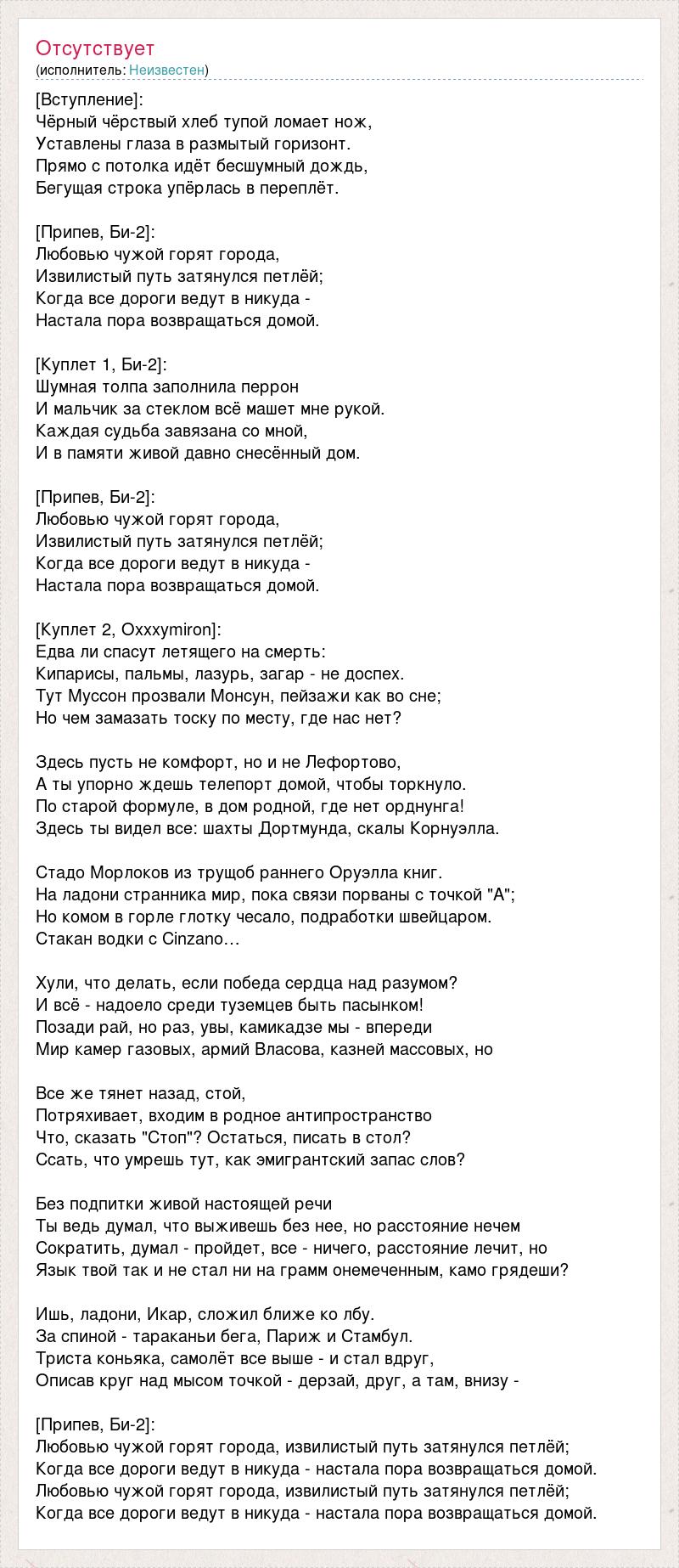 [Вступление]: Чёрный чёрствый хлеб тупой ломает нож, Уставлены глаза в размытый горизонт. Прямо с потолка идёт бесшумный дождь, Бегущая строка упёрлась в переплёт. [Припев, Би-2]: Любовью чужой горят города, Извилистый путь затянулся петлёй; Когда все дороги ведут в никуда - Настала пора возвращаться домой. [Куплет 1, Би-2]: Шумная толпа заполнила перрон И мальчик за стеклом всё машет мне рукой. Каждая судьба завязана со мной, И в памяти живой давно снесённый дом. [Припев, Би-2]: Любовью чужой горят города, Извилистый путь затянулся петлёй; Когда все дороги ведут в никуда - Настала пора возвращаться домой. [Куплет 2, Oxxxymiron]: Едва ли спасут летящего на смерть: Кипарисы, пальмы, лазурь, загар - не доспех. Тут Муссон прозвали Монсун, пейзажи как во сне; Но чем замазать тоску по месту, где нас нет? Здесь пусть не комфорт, но и не Лефортово, А ты упорно ждешь телепорт домой, чтобы торкнуло. По старой формуле, в дом родной, где нет орднунга! Здесь ты видел все: шахты Дортмунда, скалы Корнуэлла. Стадо Морлоков из трущоб раннего Оруэлла книг. На ладони странника мир, пока связи порваны с точкой "А"; Но комом в горле глотку чесало, подработки швейцаром. Стакан водки с Cinzano… Хули, что делать, если победа сердца над разумом? И всё - надоело среди туземцев быть пасынком! Позади рай, но раз, увы, камикадзе мы - впереди Мир камер газовых, армий Власова, казней массовых, но Все же тянет назад, стой, Потряхивает, входим в родное антипространство Что, сказать "Стоп"? Остаться, писать в стол? Ссать, что умрешь тут, как эмигрантский запас слов? Без подпитки живой настоящей речи Ты ведь думал, что выживешь без нее, но расстояние нечем Сократить, думал - пройдет, все - ничего, расстояние лечит, но Язык твой так и не стал ни на грамм онемеченным, камо грядеши? Ишь, ладони, Икар, сложил ближе ко лбу. За спиной - тараканьи бега, Париж и Стамбул. Триста коньяка, самолёт все выше - и стал вдруг, Описав круг над мысом точкой - дерзай, друг, а там, внизу - [Припев, Би-2]: Любовью чужой горят города, извилистый путь затянулся петлёй; Когда все дороги ведут в никуда - настала пора возвращаться домой. Любовью чужой горят города, извилистый путь затянулся петлёй; Когда все дороги ведут в никуда - настала пора возвращаться домой.