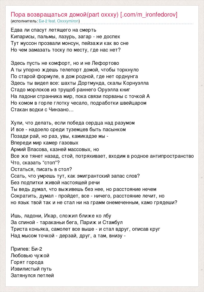 Едва ли спасут летящего на смерть Кипарисы, пальмы, лазурь, загар - не доспех Тут муссон прозвали монсун, пейзажи как во сне Но чем замазать тоску по месту, где нас нет? Здесь пусть не комфорт, но и не Лефортово А ты упорно ждешь телепорт домой, чтобы торкнуло По старой формуле, в дом родной, где нет орднунга Здесь ты видел все: шахты Дортмунда, скалы Корнуэлла Стадо морлоков из трущоб раннего Оруэлла книг На ладони странника мир, пока связи порваны с точкой А Но комом в горле глотку чесало, подработки швейцаром Стакан водки с Чинзано… Хули, что делать, если победа сердца над разумом И все - надоело среди туземцев быть пасынком Позади рай, но раз, увы, камикадзе мы - Впереди мир камер газовых Армий Власова, казней массовых, но Все же тянет назад, стой, потряхивает, входим в родное антипространство Что, сказать “стоп”? Остаться, писать в стол? Ссать, что умрешь тут, как эмигрантский запас слов? Без подпитки живой настоящей речи Ты ведь думал, что выживешь без нее, но расстояние нечем Сократить, думал - пройдет, все - ничего, расстояние лечит, но но язык твой так и не стал ни на грамм онемеченным, камо грядеши? Ишь, ладони, Икар, сложил ближе ко лбу За спиной - тараканьи бега, Париж и Стамбул Триста коньяка, самолет все выше - и стал вдруг, описав круг Над мысом точкой - дерзай, друг, а там, внизу - Припев: Би-2 Любовью чужой Горят города Извилистый путь Затянулся петлей