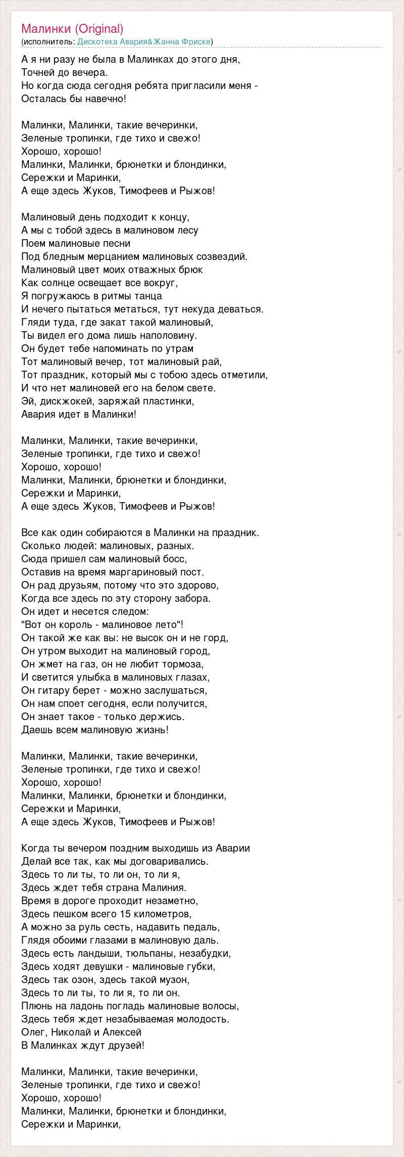 А я ни разу не была в Малинках до этого дня, Точней до вечера. Но когда сюда сегодня ребята пригласили меня - Осталась бы навечно! Малинки, Малинки, такие вечеринки, Зеленые тропинки, где тихо и свежо! Хорошо, хорошо! Малинки, Малинки, брюнетки и блондинки, Сережки и Маринки, А еще здесь Жуков, Тимофеев и Рыжов! Малиновый день подходит к концу, А мы с тобой здесь в малиновом лесу Поем малиновые песни Под бледным мерцанием малиновых созвездий. Малиновый цвет моих отважных брюк Как солнце освещает все вокруг, Я погружаюсь в ритмы танца И нечего пытаться метаться, тут некуда деваться. Гляди туда, где закат такой малиновый, Ты видел его дома лишь наполовину. Он будет тебе напоминать по утрам Тот малиновый вечер, тот малиновый рай, Тот праздник, который мы с тобою здесь отметили, И что нет малиновей его на белом свете. Эй, дискжокей, заряжай пластинки, Авария идет в Малинки! Малинки, Малинки, такие вечеринки, Зеленые тропинки, где тихо и свежо! Хорошо, хорошо! Малинки, Малинки, брюнетки и блондинки, Сережки и Маринки, А еще здесь Жуков, Тимофеев и Рыжов! Все как один собираются в Малинки на праздник. Сколько людей: малиновых, разных. Сюда пришел сам малиновый босс, Оставив на время маргариновый пост. Он рад друзьям, потому что это здорово, Когда все здесь по эту сторону забора. Он идет и несется следом: "Вот он король - малиновое лето"! Он такой же как вы: не высок он и не горд, Он утром выходит на малиновый город, Он жмет на газ, он не любит тормоза, И светится улыбка в малиновых глазах, Он гитару берет - можно заслушаться, Он нам споет сегодня, если получится, Он знает такое - только держись. Даешь всем малиновую жизнь! Малинки, Малинки, такие вечеринки, Зеленые тропинки, где тихо и свежо! Хорошо, хорошо! Малинки, Малинки, брюнетки и блондинки, Сережки и Маринки, А еще здесь Жуков, Тимофеев и Рыжов! Когда ты вечером поздним выходишь из Аварии Делай все так, как мы договаривались. Здесь то ли ты, то ли он, то ли я, Здесь ждет тебя страна Малиния. Время в дороге проходит незаметно, Здесь пешком всего 15 километров, А можно за руль сесть, надавить педаль, Глядя обоими глазами в малиновую даль. Здесь есть ландыши, тюльпаны, незабудки, Здесь ходят девушки - малиновые губки, Здесь так озон, здесь такой музон, Здесь то ли ты, то ли я, то ли он. Плюнь на ладонь погладь малиновые волосы, Здесь тебя ждет незабываемая молодость. Олег, Николай и Алексей В Малинках ждут друзей! Малинки, Малинки, такие вечеринки, Зеленые тропинки, где тихо и свежо! Хорошо, хорошо! Малинки, Малинки, брюнетки и блондинки, Сережки и Маринки,