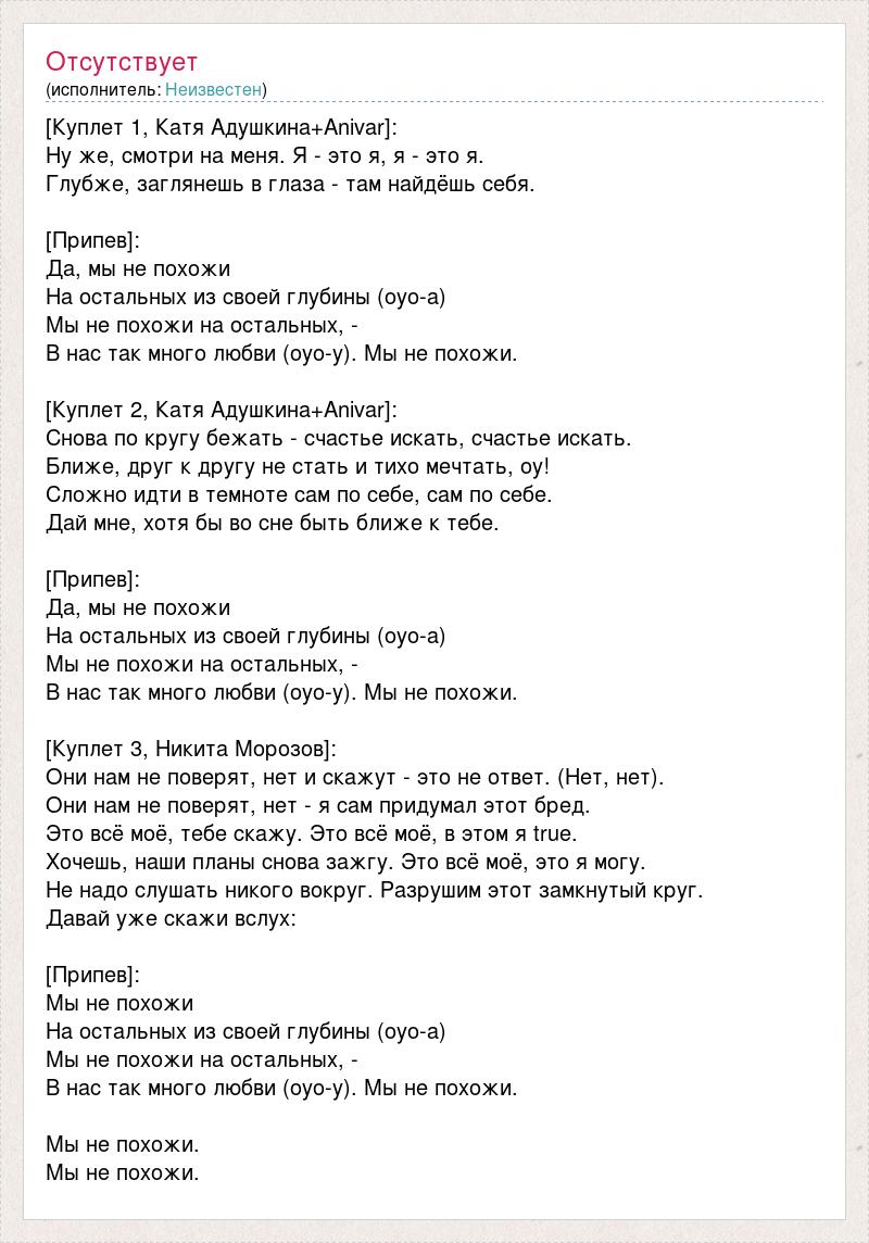 [Куплет 1, Катя Адушкина+Anivar]: Ну же, смотри на меня. Я - это я, я - это я. Глубже, заглянешь в глаза - там найдёшь себя. [Припев]: Да, мы не похожи На остальных из своей глубины (оуо-а) Мы не похожи на остальных, - В нас так много любви (оуо-у). Мы не похожи. [Куплет 2, Катя Адушкина+Anivar]: Снова по кругу бежать - счастье искать, счастье искать. Ближе, друг к другу не стать и тихо мечтать, оу! Сложно идти в темноте сам по себе, сам по себе. Дай мне, хотя бы во сне быть ближе к тебе. [Припев]: Да, мы не похожи На остальных из своей глубины (оуо-а) Мы не похожи на остальных, - В нас так много любви (оуо-у). Мы не похожи. [Куплет 3, Никита Морозов]: Они нам не поверят, нет и скажут - это не ответ. (Нет, нет). Они нам не поверят, нет - я сам придумал этот бред. Это всё моё, тебе скажу. Это всё моё, в этом я true. Хочешь, наши планы снова зажгу. Это всё моё, это я могу. Не надо слушать никого вокруг. Разрушим этот замкнутый круг. Давай уже скажи вслух: [Припев]: Мы не похожи На остальных из своей глубины (оуо-а) Мы не похожи на остальных, - В нас так много любви (оуо-у). Мы не похожи. Мы не похожи. Мы не похожи.