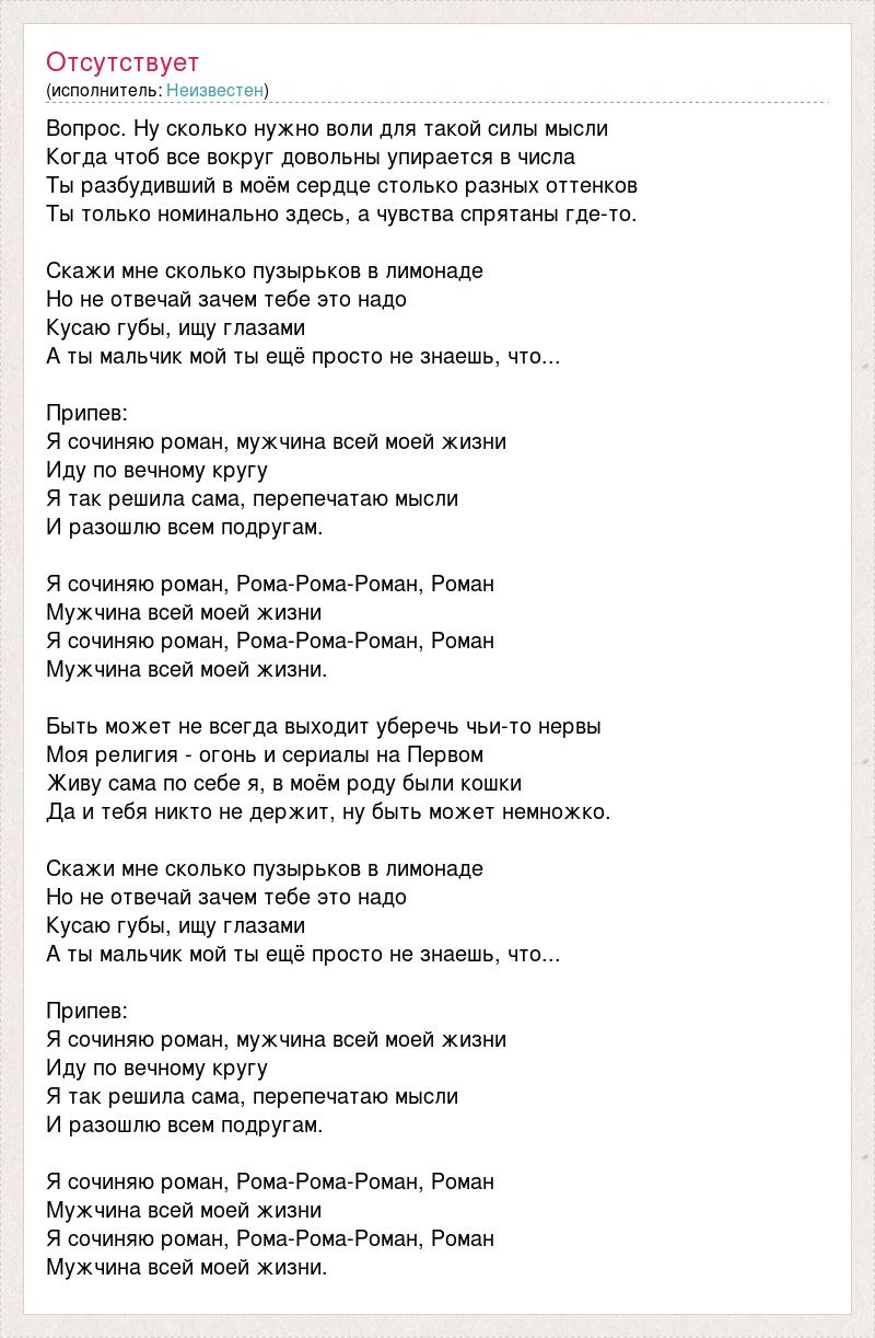 Вопрос. Ну сколько нужно воли для такой силы мысли Когда чтоб все вокруг довольны упирается в числа Ты разбудивший в моём сердце столько разных оттенков Ты только номинально здесь, а чувства спрятаны где-то. Скажи мне сколько пузырьков в лимонаде Но не отвечай зачем тебе это надо Кусаю губы, ищу глазами А ты мальчик мой ты ещё просто не знаешь, что... Припев: Я сочиняю роман, мужчина всей моей жизни Иду по вечному кругу Я так решила сама, перепечатаю мысли И разошлю всем подругам. Я сочиняю роман, Рома-Рома-Роман, Роман Мужчина всей моей жизни Я сочиняю роман, Рома-Рома-Роман, Роман Мужчина всей моей жизни. Быть может не всегда выходит уберечь чьи-то нервы Моя религия - огонь и сериалы на Первом Живу сама по себе я, в моём роду были кошки Да и тебя никто не держит, ну быть может немножко. Скажи мне сколько пузырьков в лимонаде Но не отвечай зачем тебе это надо Кусаю губы, ищу глазами А ты мальчик мой ты ещё просто не знаешь, что... Припев: Я сочиняю роман, мужчина всей моей жизни Иду по вечному кругу Я так решила сама, перепечатаю мысли И разошлю всем подругам. Я сочиняю роман, Рома-Рома-Роман, Роман Мужчина всей моей жизни Я сочиняю роман, Рома-Рома-Роман, Роман Мужчина всей моей жизни.