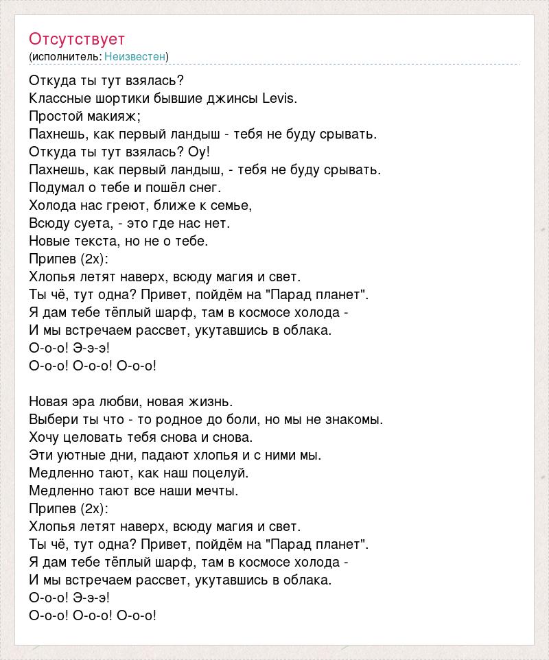Откуда ты тут взялась? Классные шортики бывшие джинсы Levis. Простой макияж; Пахнешь, как первый ландыш - тебя не буду срывать. Откуда ты тут взялась? Оу! Пахнешь, как первый ландыш, - тебя не буду срывать. Подумал о тебе и пошёл снег. Холода нас греют, ближе к семье, Всюду суета, - это где нас нет. Новые текста, но не о тебе. Припев (2x): Хлопья летят наверх, всюду магия и свет. Ты чё, тут одна? Привет, пойдём на "Парад планет". Я дам тебе тёплый шарф, там в космосе холода - И мы встречаем рассвет, укутавшись в облака. О-о-о! Э-э-э! О-о-о! О-о-о! О-о-о! Новая эра любви, новая жизнь. Выбери ты что - то родное до боли, но мы не знакомы. Хочу целовать тебя снова и снова. Эти уютные дни, падают хлопья и с ними мы. Медленно тают, как наш поцелуй. Медленно тают все наши мечты. Припев (2x): Хлопья летят наверх, всюду магия и свет. Ты чё, тут одна? Привет, пойдём на "Парад планет". Я дам тебе тёплый шарф, там в космосе холода - И мы встречаем рассвет, укутавшись в облака. О-о-о! Э-э-э! О-о-о! О-о-о! О-о-о!