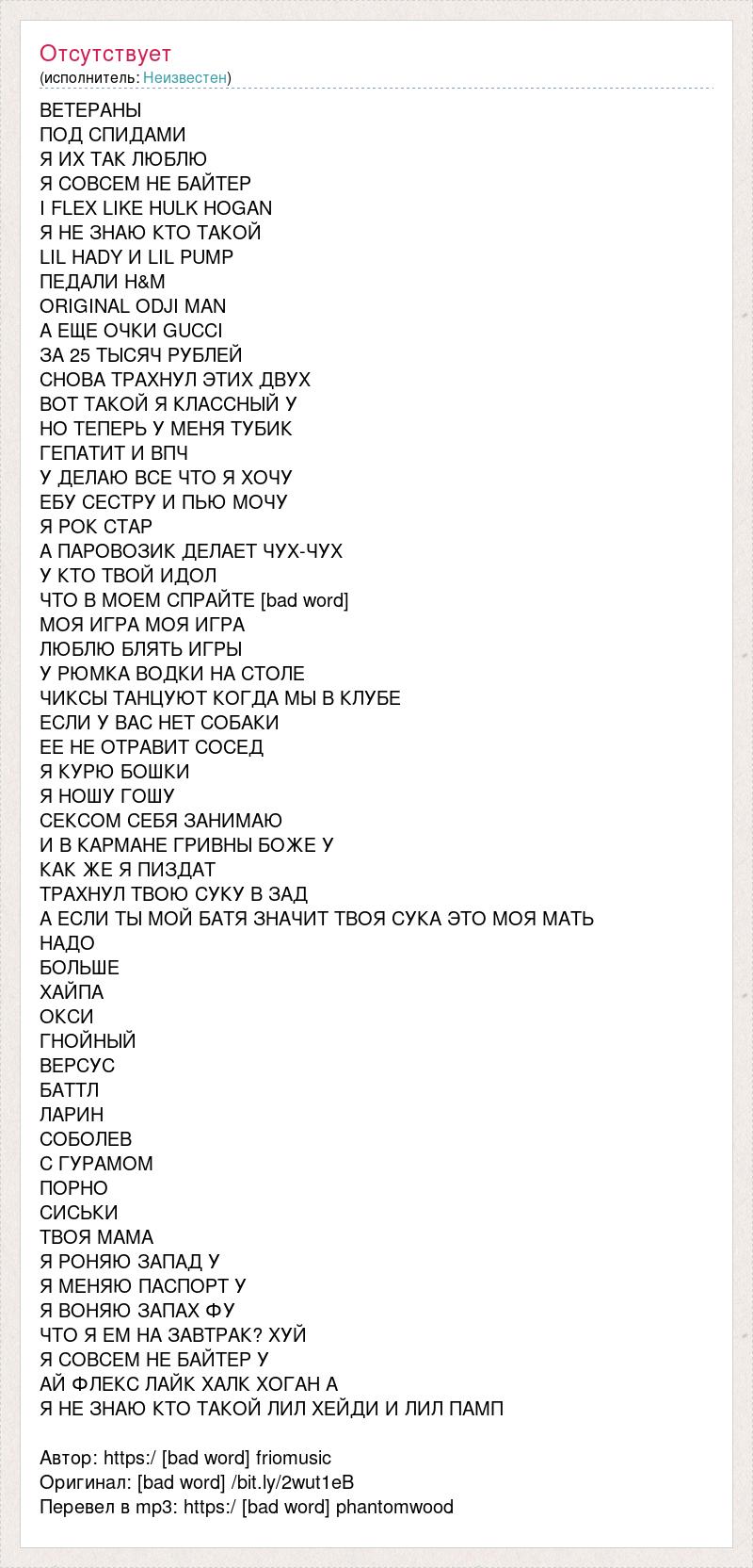 ВЕТЕРАНЫ ПОД СПИДАМИ Я ИХ ТАК ЛЮБЛЮ Я СОВСЕМ НЕ БАЙТЕР I FLEX LIKE HULK HOGAN Я НЕ ЗНАЮ КТО ТАКОЙ LIL HADY И LIL PUMP ПЕДАЛИ H&M ORIGINAL ODJI MAN А ЕЩЕ ОЧКИ GUCCI ЗА 25 ТЫСЯЧ РУБЛЕЙ СНОВА ТРАХНУЛ ЭТИХ ДВУХ ВОТ ТАКОЙ Я КЛАССНЫЙ У НО ТЕПЕРЬ У МЕНЯ ТУБИК ГЕПАТИТ И ВПЧ У ДЕЛАЮ ВСЕ ЧТО Я ХОЧУ ЕБУ СЕСТРУ И ПЬЮ МОЧУ Я РОК СТАР А ПАРОВОЗИК ДЕЛАЕТ ЧУХ-ЧУХ У КТО ТВОЙ ИДОЛ ЧТО В МОЕМ СПРАЙТЕ [bad word] МОЯ ИГРА МОЯ ИГРА ЛЮБЛЮ БЛЯТЬ ИГРЫ У РЮМКА ВОДКИ НА СТОЛЕ ЧИКСЫ ТАНЦУЮТ КОГДА МЫ В КЛУБЕ ЕСЛИ У ВАС НЕТ СОБАКИ ЕЕ НЕ ОТРАВИТ СОСЕД Я КУРЮ БОШКИ Я НОШУ ГОШУ СЕКСОМ СЕБЯ ЗАНИМАЮ И В КАРМАНЕ ГРИВНЫ БОЖЕ У КАК ЖЕ Я ПИЗДАТ ТРАХНУЛ ТВОЮ СУКУ В ЗАД А ЕСЛИ ТЫ МОЙ БАТЯ ЗНАЧИТ ТВОЯ СУКА ЭТО МОЯ МАТЬ НАДО БОЛЬШЕ ХАЙПА ОКСИ ГНОЙНЫЙ ВЕРСУС БАТТЛ ЛАРИН СОБОЛЕВ С ГУРАМОМ ПОРНО СИСЬКИ ТВОЯ МАМА Я РОНЯЮ ЗАПАД У Я МЕНЯЮ ПАСПОРТ У Я ВОНЯЮ ЗАПАХ ФУ ЧТО Я ЕМ НА ЗАВТРАК? ХУЙ Я СОВСЕМ НЕ БАЙТЕР У АЙ ФЛЕКС ЛАЙК ХАЛК ХОГАН А Я НЕ ЗНАЮ КТО ТАКОЙ ЛИЛ ХЕЙДИ И ЛИЛ ПАМП Автор: https:/ [bad word] friomusic Оригинал: [bad word] /bit.ly/2wut1eB Перевел в mp3: https:/ [bad word] phantomwood