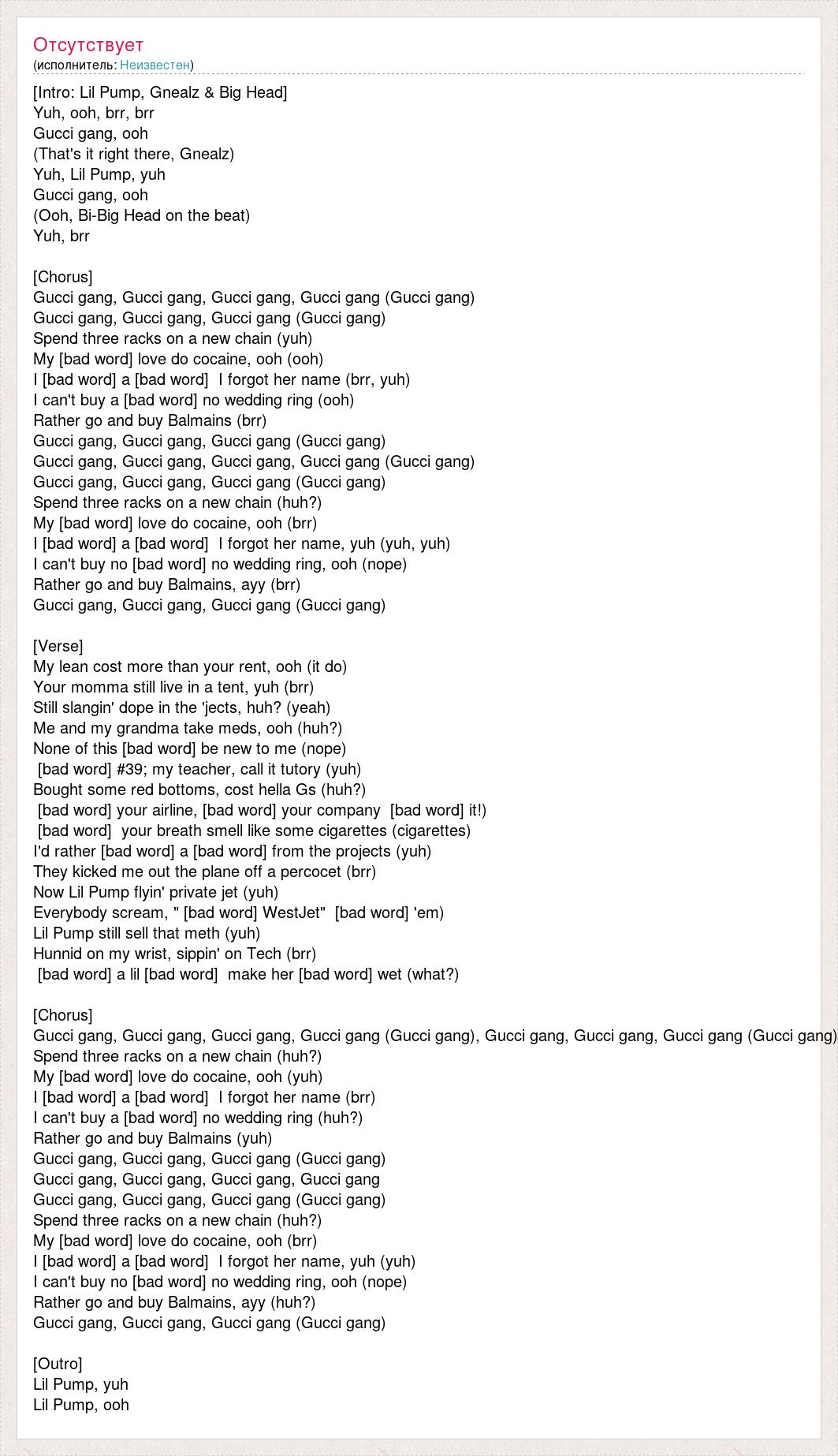 [Intro: Lil Pump, Gnealz & Big Head] Yuh, ooh, brr, brr Gucci gang, ooh (That's it right there, Gnealz) Yuh, Lil Pump, yuh Gucci gang, ooh (Ooh, Bi-Big Head on the beat) Yuh, brr [Chorus] Gucci gang, Gucci gang, Gucci gang, Gucci gang (Gucci gang) Gucci gang, Gucci gang, Gucci gang (Gucci gang) Spend three racks on a new chain (yuh) My [bad word] love do cocaine, ooh (ooh) I [bad word] a [bad word] I forgot her name (brr, yuh) I can't buy a [bad word] no wedding ring (ooh) Rather go and buy Balmains (brr) Gucci gang, Gucci gang, Gucci gang (Gucci gang) Gucci gang, Gucci gang, Gucci gang, Gucci gang (Gucci gang) Gucci gang, Gucci gang, Gucci gang (Gucci gang) Spend three racks on a new chain (huh?) My [bad word] love do cocaine, ooh (brr) I [bad word] a [bad word] I forgot her name, yuh (yuh, yuh) I can't buy no [bad word] no wedding ring, ooh (nope) Rather go and buy Balmains, ayy (brr) Gucci gang, Gucci gang, Gucci gang (Gucci gang) [Verse] My lean cost more than your rent, ooh (it do) Your momma still live in a tent, yuh (brr) Still slangin' dope in the 'jects, huh? (yeah) Me and my grandma take meds, ooh (huh?) None of this [bad word] be new to me (nope) [bad word] #39; my teacher, call it tutory (yuh) Bought some red bottoms, cost hella Gs (huh?) [bad word] your airline, [bad word] your company [bad word] it!) [bad word] your breath smell like some cigarettes (cigarettes) I'd rather [bad word] a [bad word] from the projects (yuh) They kicked me out the plane off a percocet (brr) Now Lil Pump flyin' private jet (yuh) Everybody scream, " [bad word] WestJet" [bad word] 'em) Lil Pump still sell that meth (yuh) Hunnid on my wrist, sippin' on Tech (brr) [bad word] a lil [bad word] make her [bad word] wet (what?) [Chorus] Gucci gang, Gucci gang, Gucci gang, Gucci gang (Gucci gang), Gucci gang, Gucci gang, Gucci gang (Gucci gang) Spend three racks on a new chain (huh?) My [bad word] love do cocaine, ooh (yuh) I [bad word] a [bad word] I forgot her name (brr) I can't buy a [bad word] no wedding ring (huh?) Rather go and buy Balmains (yuh) Gucci gang, Gucci gang, Gucci gang (Gucci gang) Gucci gang, Gucci gang, Gucci gang, Gucci gang Gucci gang, Gucci gang, Gucci gang (Gucci gang) Spend three racks on a new chain (huh?) My [bad word] love do cocaine, ooh (brr) I [bad word] a [bad word] I forgot her name, yuh (yuh) I can't buy no [bad word] no wedding ring, ooh (nope) Rather go and buy Balmains, ayy (huh?) Gucci gang, Gucci gang, Gucci gang (Gucci gang) [Outro] Lil Pump, yuh Lil Pump, ooh