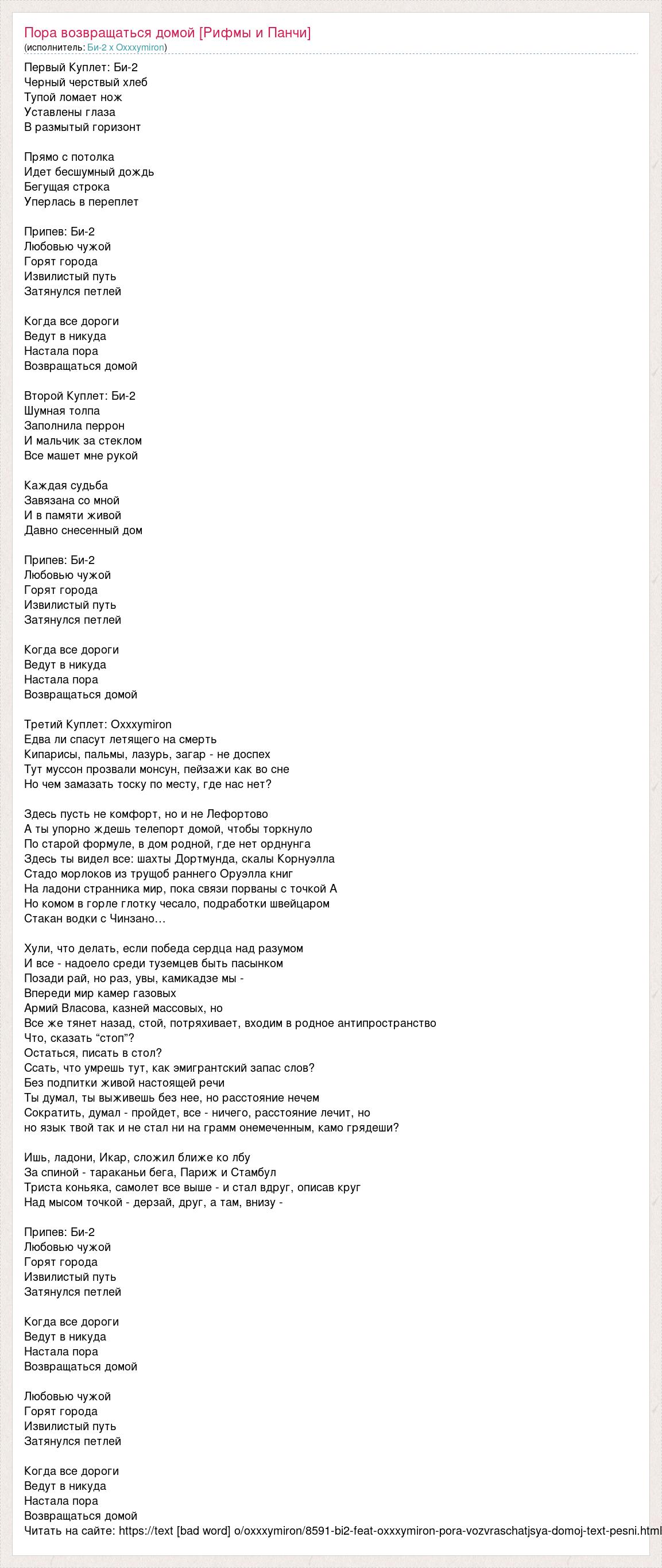 Первый Куплет: Би-2 Черный черствый хлеб Тупой ломает нож Уставлены глаза В размытый горизонт Прямо с потолка Идет бесшумный дождь Бегущая строка Уперлась в переплет Припев: Би-2 Любовью чужой Горят города Извилистый путь Затянулся петлей Когда все дороги Ведут в никуда Настала пора Возвращаться домой Второй Куплет: Би-2 Шумная толпа Заполнила перрон И мальчик за стеклом Все машет мне рукой Каждая судьба Завязана со мной И в памяти живой Давно снесенный дом Припев: Би-2 Любовью чужой Горят города Извилистый путь Затянулся петлей Когда все дороги Ведут в никуда Настала пора Возвращаться домой Третий Куплет: Oxxxymiron Едва ли спасут летящего на смерть Кипарисы, пальмы, лазурь, загар - не доспех Тут муссон прозвали монсун, пейзажи как во сне Но чем замазать тоску по месту, где нас нет? Здесь пусть не комфорт, но и не Лефортово А ты упорно ждешь телепорт домой, чтобы торкнуло По старой формуле, в дом родной, где нет орднунга Здесь ты видел все: шахты Дортмунда, скалы Корнуэлла Стадо морлоков из трущоб раннего Оруэлла книг На ладони странника мир, пока связи порваны с точкой А Но комом в горле глотку чесало, подработки швейцаром Стакан водки с Чинзано… Хули, что делать, если победа сердца над разумом И все - надоело среди туземцев быть пасынком Позади рай, но раз, увы, камикадзе мы - Впереди мир камер газовых Армий Власова, казней массовых, но Все же тянет назад, стой, потряхивает, входим в родное антипространство Что, сказать “стоп”? Остаться, писать в стол? Ссать, что умрешь тут, как эмигрантский запас слов? Без подпитки живой настоящей речи Ты думал, ты выживешь без нее, но расстояние нечем Сократить, думал - пройдет, все - ничего, расстояние лечит, но но язык твой так и не стал ни на грамм онемеченным, камо грядеши? Ишь, ладони, Икар, сложил ближе ко лбу За спиной - тараканьи бега, Париж и Стамбул Триста коньяка, самолет все выше - и стал вдруг, описав круг Над мысом точкой - дерзай, друг, а там, внизу - Припев: Би-2 Любовью чужой Горят города Извилистый путь Затянулся петлей Когда все дороги Ведут в никуда Настала пора Возвращаться домой Любовью чужой Горят города Извилистый путь Затянулся петлей Когда все дороги Ведут в никуда Настала пора Возвращаться домой Читать на сайте: https://text [bad word] o/oxxxymiron/8591-bi2-feat-oxxxymiron-pora-vozvraschatjsya-domoj-text-pesni.html