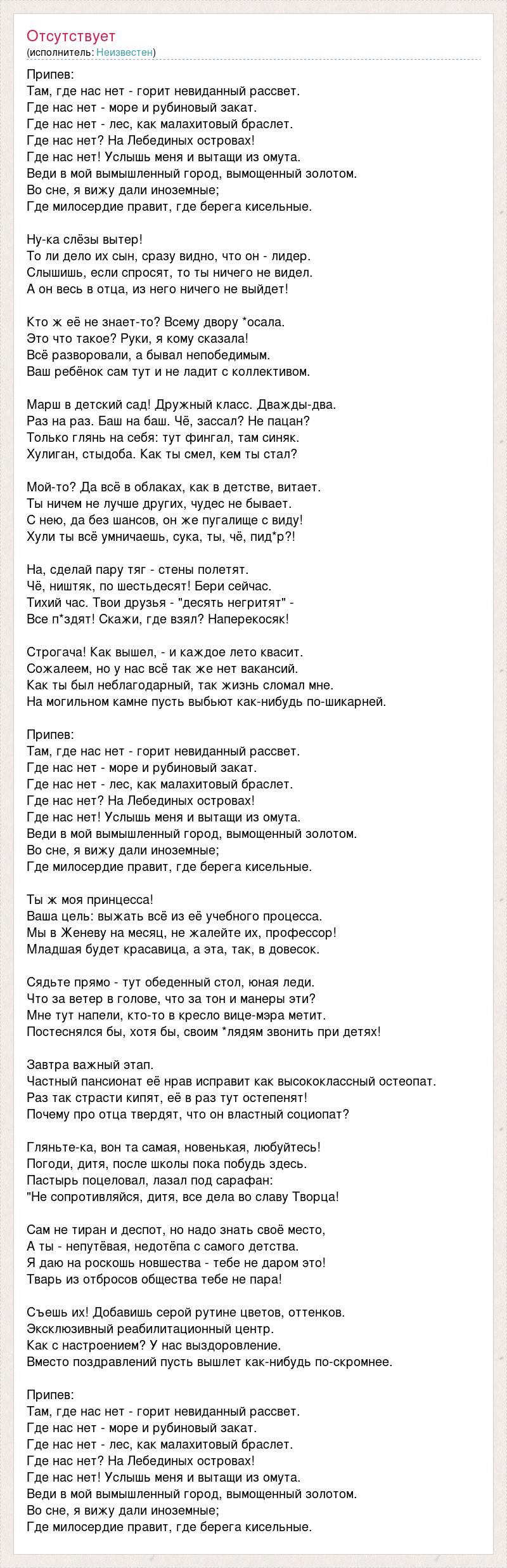 Припев: Там, где нас нет - горит невиданный рассвет. Где нас нет - море и рубиновый закат. Где нас нет - лес, как малахитовый браслет. Где нас нет? На Лебединых островах! Где нас нет! Услышь меня и вытащи из омута. Веди в мой вымышленный город, вымощенный золотом. Во сне, я вижу дали иноземные; Где милосердие правит, где берега кисельные. Ну-ка слёзы вытер! То ли дело их сын, сразу видно, что он - лидер. Слышишь, если спросят, то ты ничего не видел. А он весь в отца, из него ничего не выйдет! Кто ж её не знает-то? Всему двору *осала. Это что такое? Руки, я кому сказала! Всё разворовали, а бывал непобедимым. Ваш ребёнок сам тут и не ладит с коллективом. Марш в детский сад! Дружный класс. Дважды-два. Раз на раз. Баш на баш. Чё, зассал? Не пацан? Только глянь на себя: тут фингал, там синяк. Хулиган, стыдоба. Как ты смел, кем ты стал? Мой-то? Да всё в облаках, как в детстве, витает. Ты ничем не лучше других, чудес не бывает. С нею, да без шансов, он же пугалище с виду! Хули ты всё умничаешь, сука, ты, чё, пид*р?! На, сделай пару тяг - стены полетят. Чё, ништяк, по шестьдесят! Бери сейчас. Тихий час. Твои друзья - "десять негритят" - Все п*здят! Скажи, где взял? Наперекосяк! Строгача! Как вышел, - и каждое лето квасит. Сожалеем, но у нас всё так же нет вакансий. Как ты был неблагодарный, так жизнь сломал мне. На могильном камне пусть выбьют как-нибудь по-шикарней. Припев: Там, где нас нет - горит невиданный рассвет. Где нас нет - море и рубиновый закат. Где нас нет - лес, как малахитовый браслет. Где нас нет? На Лебединых островах! Где нас нет! Услышь меня и вытащи из омута. Веди в мой вымышленный город, вымощенный золотом. Во сне, я вижу дали иноземные; Где милосердие правит, где берега кисельные. Ты ж моя принцесса! Ваша цель: выжать всё из её учебного процесса. Мы в Женеву на месяц, не жалейте их, профессор! Младшая будет красавица, а эта, так, в довесок. Сядьте прямо - тут обеденный стол, юная леди. Что за ветер в голове, что за тон и манеры эти? Мне тут напели, кто-то в кресло вице-мэра метит. Постеснялся бы, хотя бы, своим *лядям звонить при детях! Завтра важный этап. Частный пансионат её нрав исправит как высококлассный остеопат. Раз так страсти кипят, её в раз тут остепенят! Почему про отца твердят, что он властный социопат? Гляньте-ка, вон та самая, новенькая, любуйтесь! Погоди, дитя, после школы пока побудь здесь. Пастырь поцеловал, лазал под сарафан: "Не сопротивляйся, дитя, все дела во славу Творца! Сам не тиран и деспот, но надо знать своё место, А ты - непутёвая, недотёпа с самого детства. Я даю на роскошь новшества - тебе не даром это! Тварь из отбросов общества тебе не пара! Съешь их! Добавишь серой рутине цветов, оттенков. Эксклюзивный реабилитационный центр. Как с настроением? У нас выздоровление. Вместо поздравлений пусть вышлет как-нибудь по-скромнее. Припев: Там, где нас нет - горит невиданный рассвет. Где нас нет - море и рубиновый закат. Где нас нет - лес, как малахитовый браслет. Где нас нет? На Лебединых островах! Где нас нет! Услышь меня и вытащи из омута. Веди в мой вымышленный город, вымощенный золотом. Во сне, я вижу дали иноземные; Где милосердие правит, где берега кисельные.