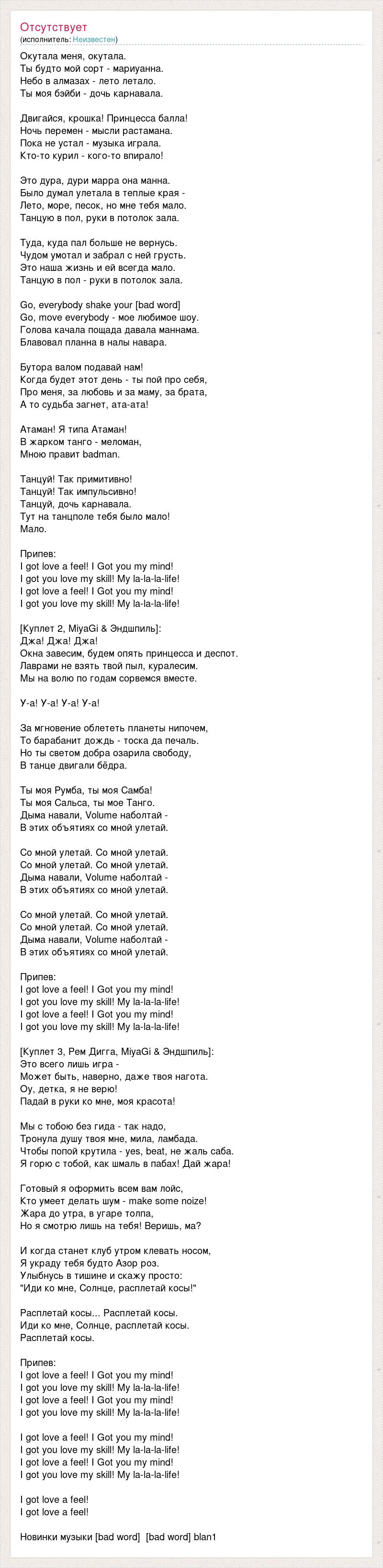 Окутала меня, окутала. Ты будто мой сорт - мариуанна. Небо в алмазах - лето летало. Ты моя бэйби - дочь карнавала. Двигайся, крошка! Принцесса балла! Ночь перемен - мысли растамана. Пока не устал - музыка играла. Кто-то курил - кого-то впирало! Это дура, дури марра она манна. Было думал улетала в теплые края - Лето, море, песок, но мне тебя мало. Танцую в пол, руки в потолок зала. Туда, куда пал больше не вернусь. Чудом умотал и забрал с ней грусть. Это наша жизнь и ей всегда мало. Танцую в пол - руки в потолок зала. Go, everybody shake your [bad word] Go, move everybody - мое любимое шоу. Голова качала пощада давала маннама. Блавовал планна в налы навара. Бутора валом подавай нам! Когда будет этот день - ты пой про себя, Про меня, за любовь и за маму, за брата, А то судьба загнет, ата-ата! Атаман! Я типа Атаман! В жарком танго - меломан, Мною правит badman. Танцуй! Так примитивно! Танцуй! Так импульсивно! Танцуй, дочь карнавала. Тут на танцполе тебя было мало! Мало. Припев: I got love a feel! I Got you my mind! I got you love my skill! My la-la-la-life! I got love a feel! I Got you my mind! I got you love my skill! My la-la-la-life! [Куплет 2, MiyaGi & Эндшпиль]: Джа! Джа! Джа! Окна завесим, будем опять принцесса и деспот. Лаврами не взять твой пыл, куралесим. Мы на волю по годам сорвемся вместе. У-а! У-а! У-а! У-а! За мгновение облететь планеты нипочем, То барабанит дождь - тоска да печаль. Но ты светом добра озарила свободу, В танце двигали бёдра. Ты моя Румба, ты моя Самба! Ты моя Сальса, ты мое Танго. Дыма навали, Volume наболтай - В этих объятиях со мной улетай. Со мной улетай. Со мной улетай. Со мной улетай. Со мной улетай. Дыма навали, Volume наболтай - В этих объятиях со мной улетай. Со мной улетай. Со мной улетай. Со мной улетай. Со мной улетай. Дыма навали, Volume наболтай - В этих объятиях со мной улетай. Припев: I got love a feel! I Got you my mind! I got you love my skill! My la-la-la-life! I got love a feel! I Got you my mind! I got you love my skill! My la-la-la-life! [Куплет 3, Рем Дигга, MiyaGi & Эндшпиль]: Это всего лишь игра - Может быть, наверно, даже твоя нагота. Оу, детка, я не верю! Падай в руки ко мне, моя красота! Мы с тобою без гида - так надо, Тронула душу твоя мне, мила, ламбада. Чтобы попой крутила - yes, beat, не жаль саба. Я горю с тобой, как шмаль в пабах! Дай жара! Готовый я оформить всем вам лойс, Кто умеет делать шум - make some noize! Жара до утра, в угаре толпа, Но я смотрю лишь на тебя! Веришь, ма? И когда станет клуб утром клевать носом, Я украду тебя будто Азор роз. Улыбнусь в тишине и скажу просто: "Иди ко мне, Солнце, расплетай косы!" Расплетай косы... Расплетай косы. Иди ко мне, Солнце, расплетай косы. Расплетай косы. Припев: I got love a feel! I Got you my mind! I got you love my skill! My la-la-la-life! I got love a feel! I Got you my mind! I got you love my skill! My la-la-la-life! I got love a feel! I Got you my mind! I got you love my skill! My la-la-la-life! I got love a feel! I Got you my mind! I got you love my skill! My la-la-la-life! I got love a feel! I got love a feel! Новинки музыки [bad word] [bad word] blan1