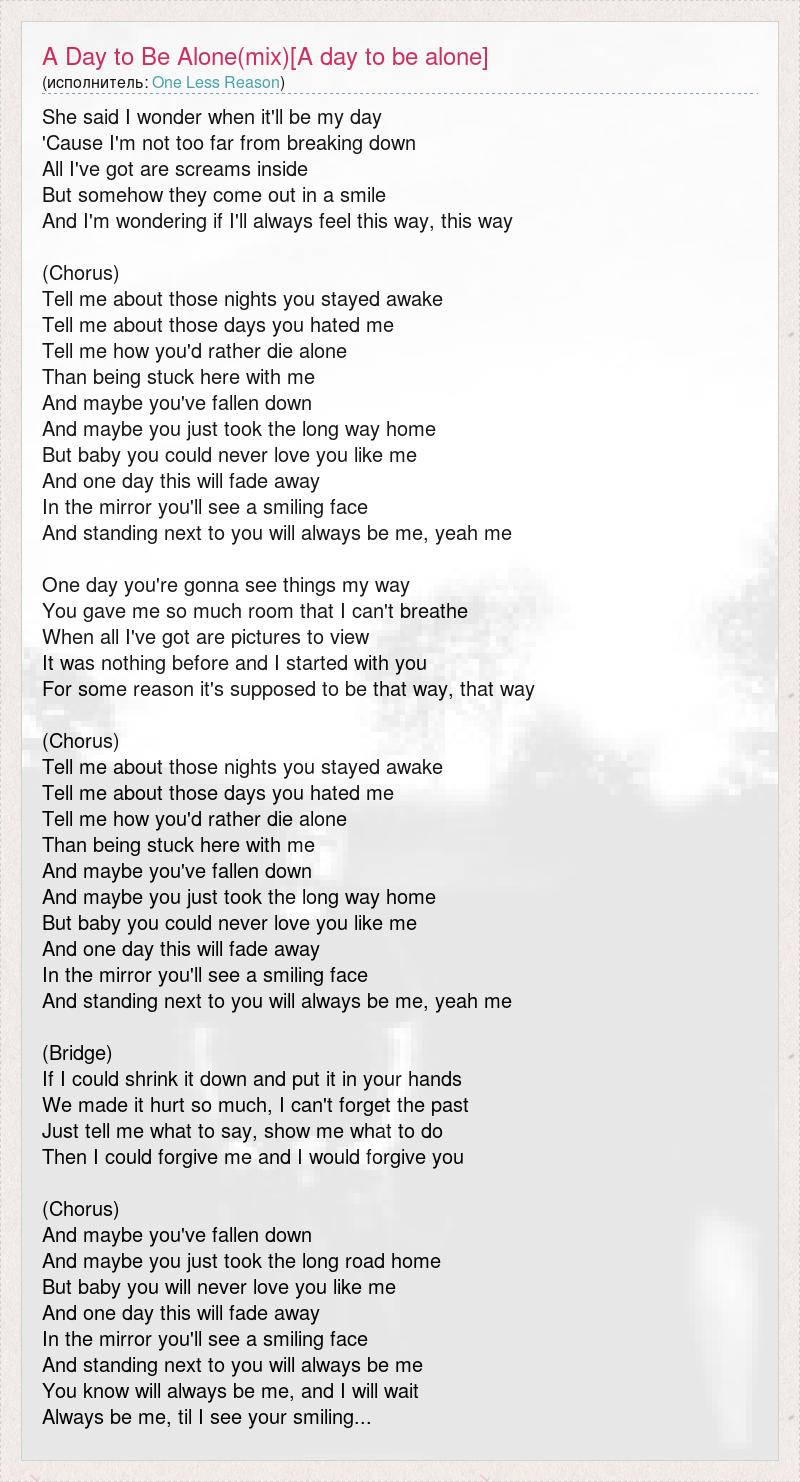 She said I wonder when it'll be my day 'Cause I'm not too far from breaking down All I've got are screams inside But somehow they come out in a smile And I'm wondering if I'll always feel this way, this way (Chorus) Tell me about those nights you stayed awake Tell me about those days you hated me Tell me how you'd rather die alone Than being stuck here with me And maybe you've fallen down And maybe you just took the long way home But baby you could never love you like me And one day this will fade away In the mirror you'll see a smiling face And standing next to you will always be me, yeah me One day you're gonna see things my way You gave me so much room that I can't breathe When all I've got are pictures to view It was nothing before and I started with you For some reason it's supposed to be that way, that way (Chorus) Tell me about those nights you stayed awake Tell me about those days you hated me Tell me how you'd rather die alone Than being stuck here with me And maybe you've fallen down And maybe you just took the long way home But baby you could never love you like me And one day this will fade away In the mirror you'll see a smiling face And standing next to you will always be me, yeah me (Bridge) If I could shrink it down and put it in your hands We made it hurt so much, I can't forget the past Just tell me what to say, show me what to do Then I could forgive me and I would forgive you (Chorus) And maybe you've fallen down And maybe you just took the long road home But baby you will never love you like me And one day this will fade away In the mirror you'll see a smiling face And standing next to you will always be me You know will always be me, and I will wait Always be me, til I see your smiling...