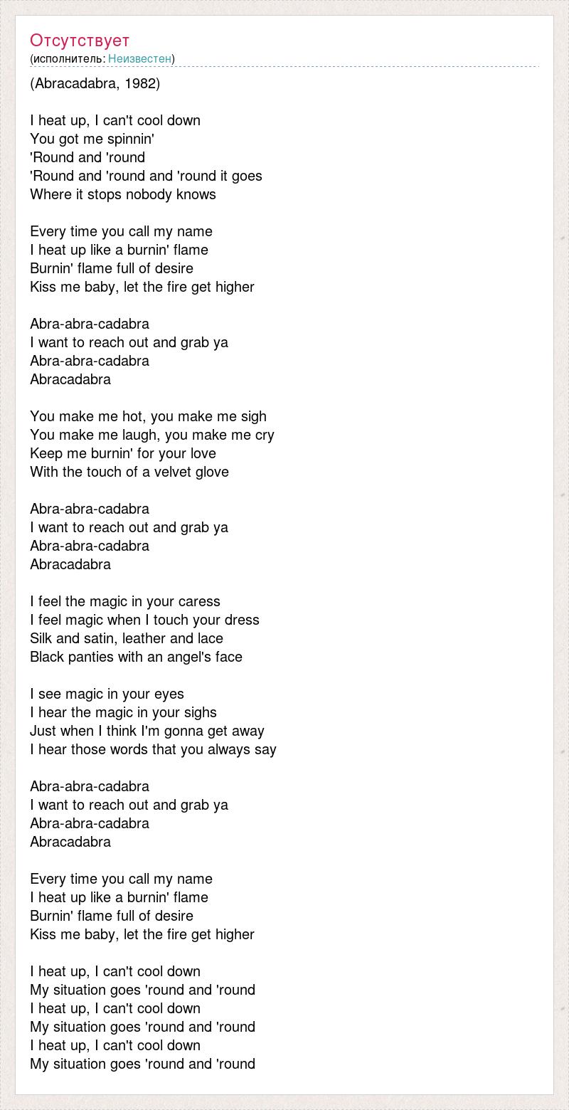 (Abracadabra, 1982) I heat up, I can't cool down You got me spinnin' 'Round and 'round 'Round and 'round and 'round it goes Where it stops nobody knows Every time you call my name I heat up like a burnin' flame Burnin' flame full of desire Kiss me baby, let the fire get higher Abra-abra-cadabra I want to reach out and grab ya Abra-abra-cadabra Abracadabra You make me hot, you make me sigh You make me laugh, you make me cry Keep me burnin' for your love With the touch of a velvet glove Abra-abra-cadabra I want to reach out and grab ya Abra-abra-cadabra Abracadabra I feel the magic in your caress I feel magic when I touch your dress Silk and satin, leather and lace Black panties with an angel's face I see magic in your eyes I hear the magic in your sighs Just when I think I'm gonna get away I hear those words that you always say Abra-abra-cadabra I want to reach out and grab ya Abra-abra-cadabra Abracadabra Every time you call my name I heat up like a burnin' flame Burnin' flame full of desire Kiss me baby, let the fire get higher I heat up, I can't cool down My situation goes 'round and 'round I heat up, I can't cool down My situation goes 'round and 'round I heat up, I can't cool down My situation goes 'round and 'round