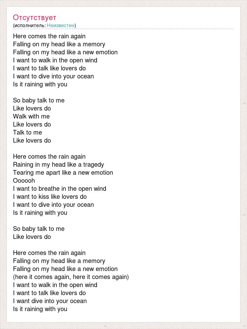 Here comes the rain again Falling on my head like a memory Falling on my head like a new emotion I want to walk in the open wind I want to talk like lovers do I want to dive into your ocean Is it raining with you So baby talk to me Like lovers do Walk with me Like lovers do Talk to me Like lovers do Here comes the rain again Raining in my head like a tragedy Tearing me apart like a new emotion Oooooh I want to breathe in the open wind I want to kiss like lovers do I want to dive into your ocean Is it raining with you So baby talk to me Like lovers do Here comes the rain again Falling on my head like a memory Falling on my head like a new emotion (here it comes again, here it comes again) I want to walk in the open wind I want to talk like lovers do I want dive into your ocean Is it raining with you