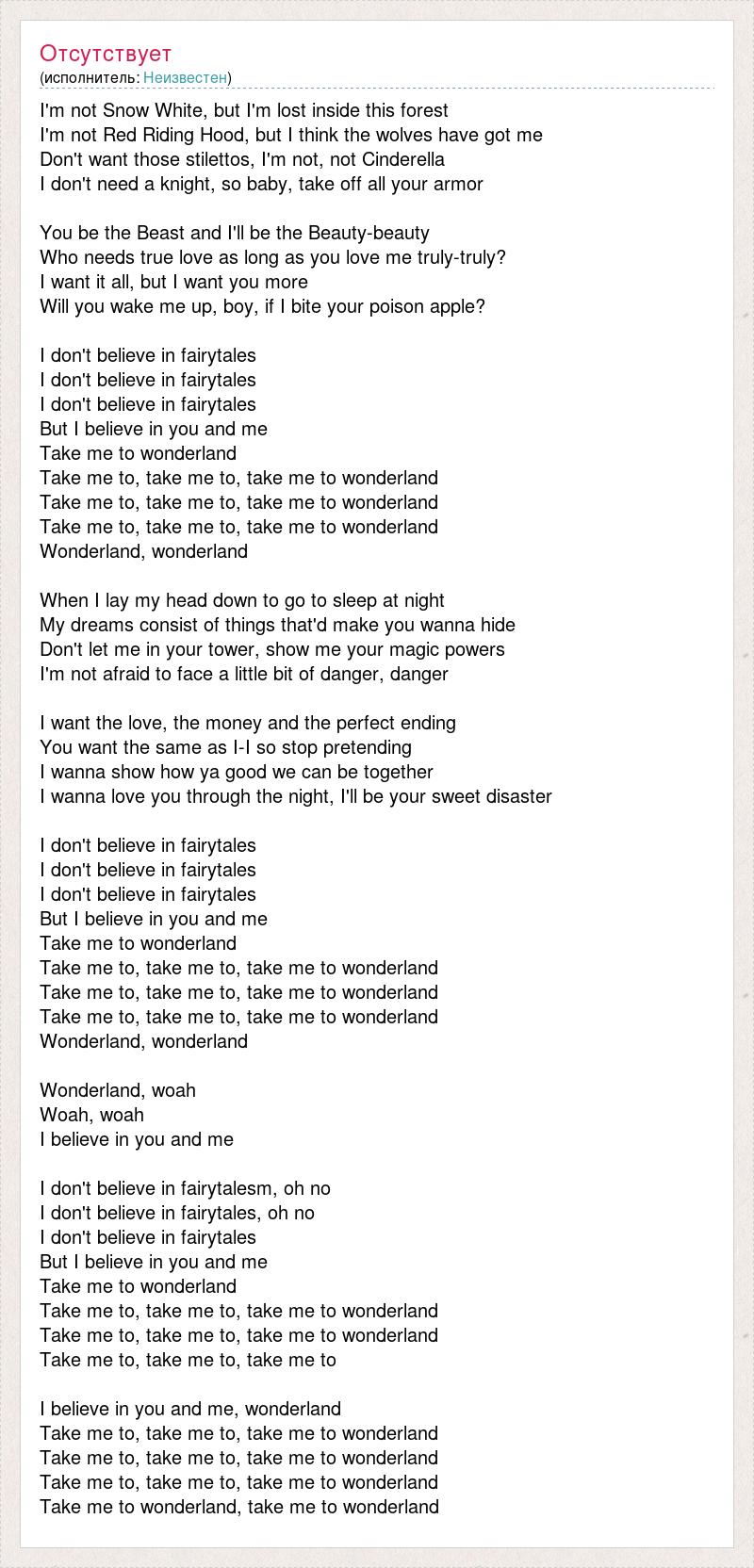 I'm not Snow White, but I'm lost inside this forest I'm not Red Riding Hood, but I think the wolves have got me Don't want those stilettos, I'm not, not Cinderella I don't need a knight, so baby, take off all your armor You be the Beast and I'll be the Beauty-beauty Who needs true love as long as you love me truly-truly? I want it all, but I want you more Will you wake me up, boy, if I bite your poison apple? I don't believe in fairytales I don't believe in fairytales I don't believe in fairytales But I believe in you and me Take me to wonderland Take me to, take me to, take me to wonderland Take me to, take me to, take me to wonderland Take me to, take me to, take me to wonderland Wonderland, wonderland When I lay my head down to go to sleep at night My dreams consist of things that'd make you wanna hide Don't let me in your tower, show me your magic powers I'm not afraid to face a little bit of danger, danger I want the love, the money and the perfect ending You want the same as I-I so stop pretending I wanna show how ya good we can be together I wanna love you through the night, I'll be your sweet disaster I don't believe in fairytales I don't believe in fairytales I don't believe in fairytales But I believe in you and me Take me to wonderland Take me to, take me to, take me to wonderland Take me to, take me to, take me to wonderland Take me to, take me to, take me to wonderland Wonderland, wonderland Wonderland, woah Woah, woah I believe in you and me I don't believe in fairytalesm, oh no I don't believe in fairytales, oh no I don't believe in fairytales But I believe in you and me Take me to wonderland Take me to, take me to, take me to wonderland Take me to, take me to, take me to wonderland Take me to, take me to, take me to I believe in you and me, wonderland Take me to, take me to, take me to wonderland Take me to, take me to, take me to wonderland Take me to, take me to, take me to wonderland Take me to wonderland, take me to wonderland