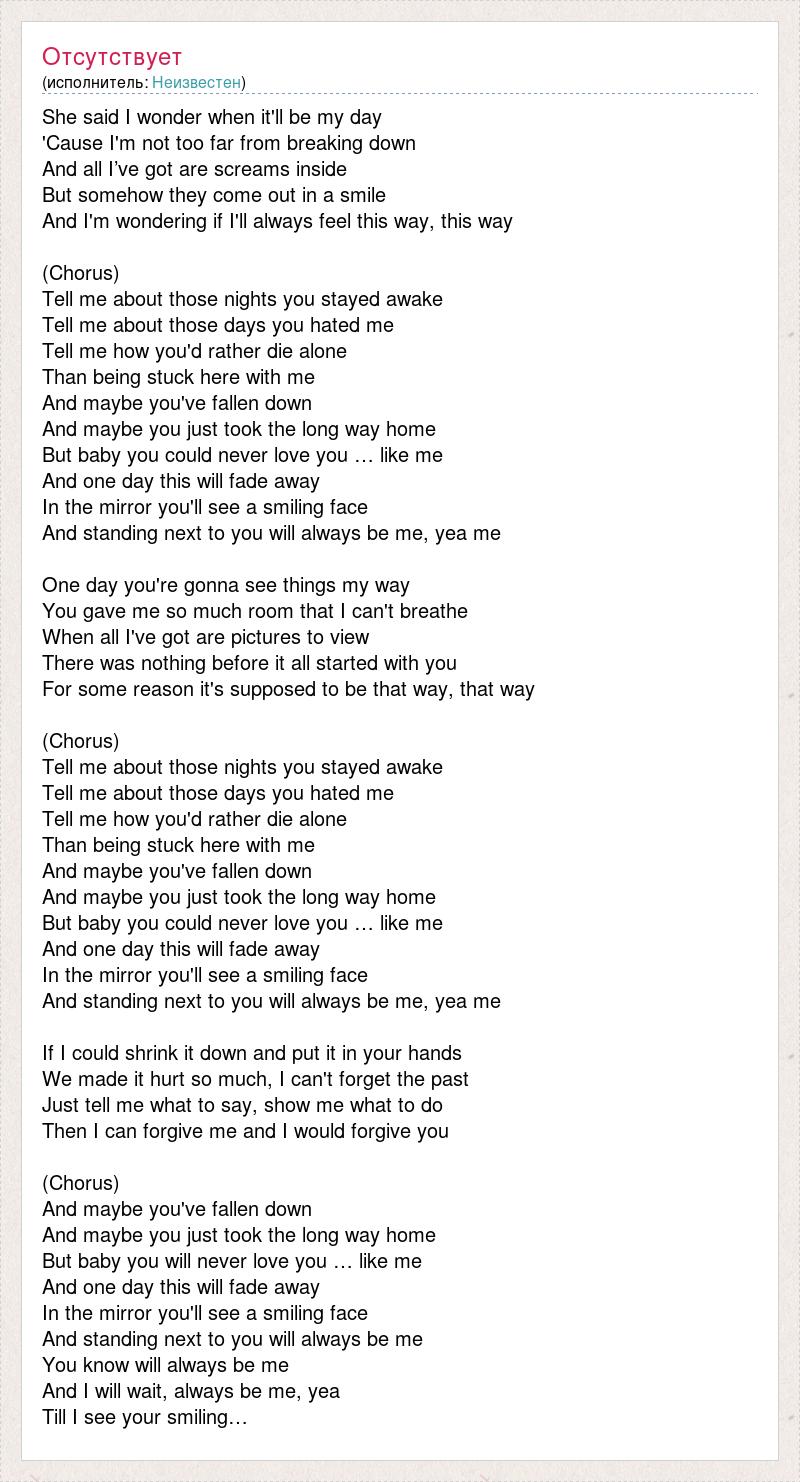 She said I wonder when it'll be my day 'Cause I'm not too far from breaking down And all I’ve got are screams inside But somehow they come out in a smile And I'm wondering if I'll always feel this way, this way (Chorus) Tell me about those nights you stayed awake Tell me about those days you hated me Tell me how you'd rather die alone Than being stuck here with me And maybe you've fallen down And maybe you just took the long way home But baby you could never love you … like me And one day this will fade away In the mirror you'll see a smiling face And standing next to you will always be me, yea me One day you're gonna see things my way You gave me so much room that I can't breathe When all I've got are pictures to view There was nothing before it all started with you For some reason it's supposed to be that way, that way (Chorus) Tell me about those nights you stayed awake Tell me about those days you hated me Tell me how you'd rather die alone Than being stuck here with me And maybe you've fallen down And maybe you just took the long way home But baby you could never love you … like me And one day this will fade away In the mirror you'll see a smiling face And standing next to you will always be me, yea me If I could shrink it down and put it in your hands We made it hurt so much, I can't forget the past Just tell me what to say, show me what to do Then I can forgive me and I would forgive you (Chorus) And maybe you've fallen down And maybe you just took the long way home But baby you will never love you … like me And one day this will fade away In the mirror you'll see a smiling face And standing next to you will always be me You know will always be me And I will wait, always be me, yea Till I see your smiling…