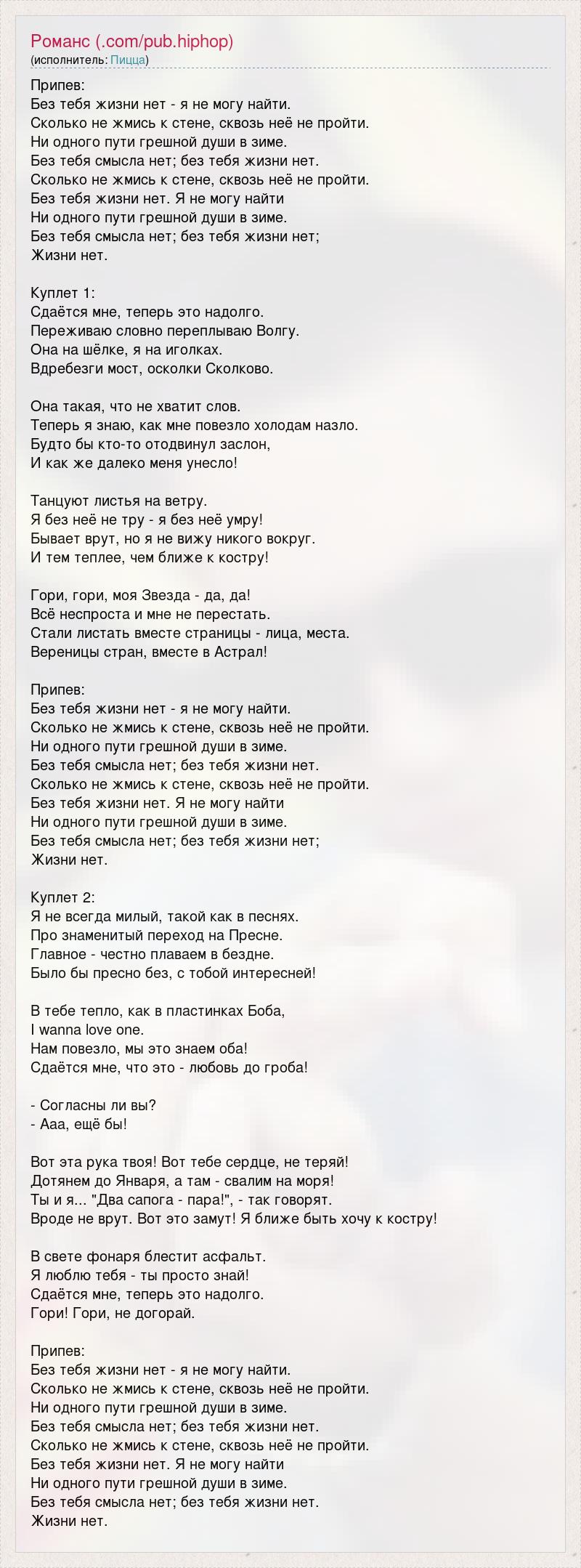 Припев: Без тебя жизни нет - я не могу найти. Сколько не жмись к стене, сквозь неё не пройти. Ни одного пути грешной души в зиме. Без тебя смысла нет; без тебя жизни нет. Сколько не жмись к стене, сквозь неё не пройти. Без тебя жизни нет. Я не могу найти Ни одного пути грешной души в зиме. Без тебя смысла нет; без тебя жизни нет; Жизни нет. Куплет 1: Сдаётся мне, теперь это надолго. Переживаю словно переплываю Волгу. Она на шёлке, я на иголках. Вдребезги мост, осколки Сколково. Она такая, что не хватит слов. Теперь я знаю, как мне повезло холодам назло. Будто бы кто-то отодвинул заслон, И как же далеко меня унесло! Танцуют листья на ветру. Я без неё не тру - я без неё умру! Бывает врут, но я не вижу никого вокруг. И тем теплее, чем ближе к костру! Гори, гори, моя Звезда - да, да! Всё неспроста и мне не перестать. Стали листать вместе страницы - лица, места. Вереницы стран, вместе в Астрал! Припев: Без тебя жизни нет - я не могу найти. Сколько не жмись к стене, сквозь неё не пройти. Ни одного пути грешной души в зиме. Без тебя смысла нет; без тебя жизни нет. Сколько не жмись к стене, сквозь неё не пройти. Без тебя жизни нет. Я не могу найти Ни одного пути грешной души в зиме. Без тебя смысла нет; без тебя жизни нет; Жизни нет. Куплет 2: Я не всегда милый, такой как в песнях. Про знаменитый переход на Пресне. Главное - честно плаваем в бездне. Было бы пресно без, с тобой интересней! В тебе тепло, как в пластинках Боба, I wanna love one. Нам повезло, мы это знаем оба! Сдаётся мне, что это - любовь до гроба! - Согласны ли вы? - Ааа, ещё бы! Вот эта рука твоя! Вот тебе сердце, не теряй! Дотянем до Января, а там - свалим на моря! Ты и я... "Два сапога - пара!", - так говорят. Вроде не врут. Вот это замут! Я ближе быть хочу к костру! В свете фонаря блестит асфальт. Я люблю тебя - ты просто знай! Сдаётся мне, теперь это надолго. Гори! Гори, не догорай. Припев: Без тебя жизни нет - я не могу найти. Сколько не жмись к стене, сквозь неё не пройти. Ни одного пути грешной души в зиме. Без тебя смысла нет; без тебя жизни нет. Сколько не жмись к стене, сквозь неё не пройти. Без тебя жизни нет. Я не могу найти Ни одного пути грешной души в зиме. Без тебя смысла нет; без тебя жизни нет. Жизни нет.