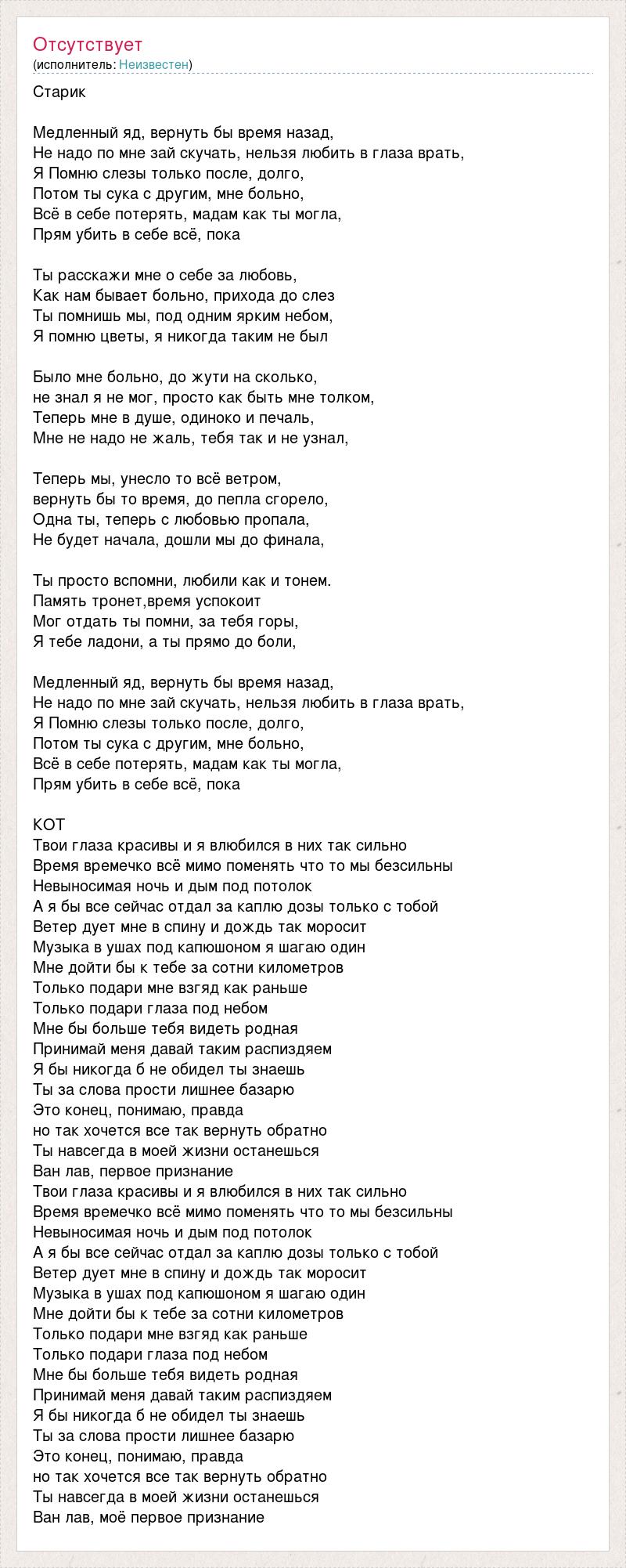 Старик Медленный яд, вернуть бы время назад, Не надо по мне зай скучать, нельзя любить в глаза врать, Я Помню слезы только после, долго, Потом ты сука с другим, мне больно, Всё в себе потерять, мадам как ты могла, Прям убить в себе всё, пока Ты расскажи мне о себе за любовь, Как нам бывает больно, прихода до слез Ты помнишь мы, под одним ярким небом, Я помню цветы, я никогда таким не был Было мне больно, до жути на сколько, не знал я не мог, просто как быть мне толком, Теперь мне в душе, одиноко и печаль, Мне не надо не жаль, тебя так и не узнал, Теперь мы, унесло то всё ветром, вернуть бы то время, до пепла сгорело, Одна ты, теперь с любовью пропала, Не будет начала, дошли мы до финала, Ты просто вспомни, любили как и тонем. Память тронет,время успокоит Мог отдать ты помни, за тебя горы, Я тебе ладони, а ты прямо до боли, Медленный яд, вернуть бы время назад, Не надо по мне зай скучать, нельзя любить в глаза врать, Я Помню слезы только после, долго, Потом ты сука с другим, мне больно, Всё в себе потерять, мадам как ты могла, Прям убить в себе всё, пока КОТ Твои глаза красивы и я влюбился в них так сильно Время времечко всё мимо поменять что то мы безсильны Невыносимая ночь и дым под потолок А я бы все сейчас отдал за каплю дозы только с тобой Ветер дует мне в спину и дождь так моросит Музыка в ушах под капюшоном я шагаю один Мне дойти бы к тебе за сотни километров Только подари мне взгяд как раньше Только подари глаза под небом Мне бы больше тебя видеть родная Принимай меня давай таким распиздяем Я бы никогда б не обидел ты знаешь Ты за слова прости лишнее базарю Это конец, понимаю, правда но так хочется все так вернуть обратно Ты навсегда в моей жизни останешься Ван лав, первое признание Твои глаза красивы и я влюбился в них так сильно Время времечко всё мимо поменять что то мы безсильны Невыносимая ночь и дым под потолок А я бы все сейчас отдал за каплю дозы только с тобой Ветер дует мне в спину и дождь так моросит Музыка в ушах под капюшоном я шагаю один Мне дойти бы к тебе за сотни километров Только подари мне взгяд как раньше Только подари глаза под небом Мне бы больше тебя видеть родная Принимай меня давай таким распиздяем Я бы никогда б не обидел ты знаешь Ты за слова прости лишнее базарю Это конец, понимаю, правда но так хочется все так вернуть обратно Ты навсегда в моей жизни останешься Ван лав, моё первое признание