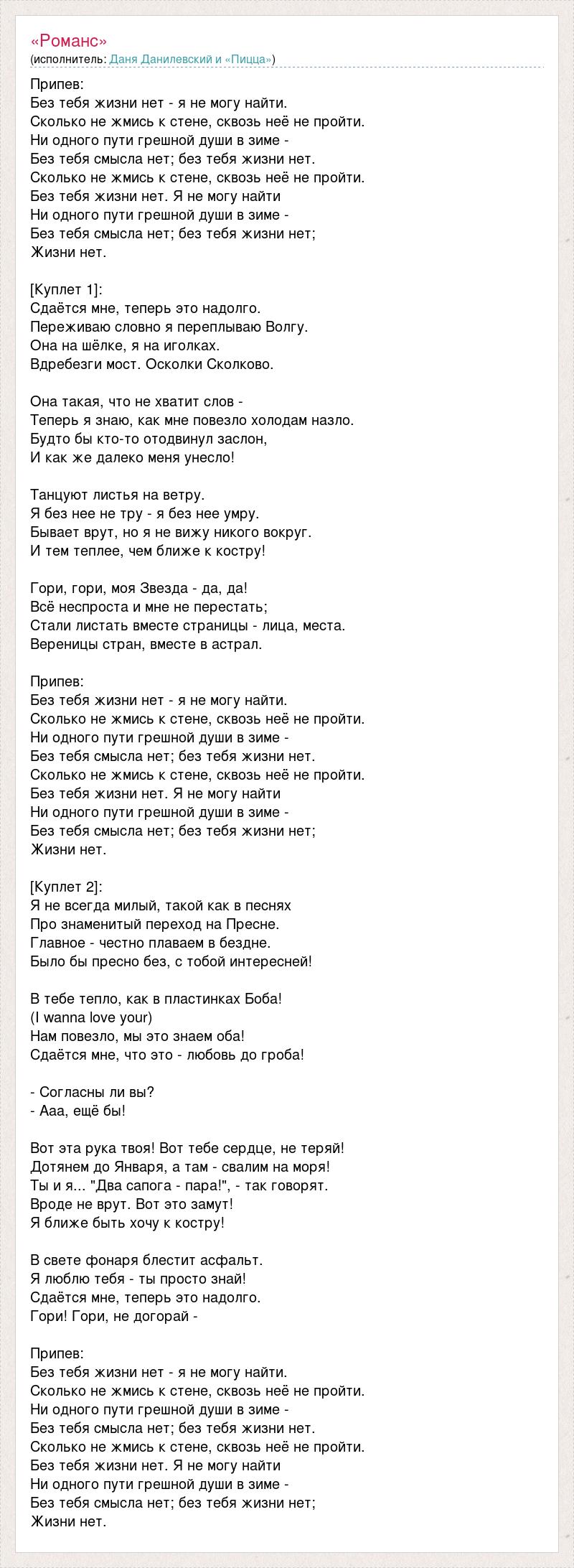 Припев: Без тебя жизни нет - я не могу найти. Сколько не жмись к стене, сквозь неё не пройти. Ни одного пути грешной души в зиме - Без тебя смысла нет; без тебя жизни нет. Сколько не жмись к стене, сквозь неё не пройти. Без тебя жизни нет. Я не могу найти Ни одного пути грешной души в зиме - Без тебя смысла нет; без тебя жизни нет; Жизни нет. [Куплет 1]: Сдаётся мне, теперь это надолго. Переживаю словно я переплываю Волгу. Она на шёлке, я на иголках. Вдребезги мост. Осколки Сколково. Она такая, что не хватит слов - Теперь я знаю, как мне повезло холодам назло. Будто бы кто-то отодвинул заслон, И как же далеко меня унесло! Танцуют листья на ветру. Я без нее не тру - я без нее умру. Бывает врут, но я не вижу никого вокруг. И тем теплее, чем ближе к костру! Гори, гори, моя Звезда - да, да! Всё неспроста и мне не перестать; Стали листать вместе страницы - лица, места. Вереницы стран, вместе в астрал. Припев: Без тебя жизни нет - я не могу найти. Сколько не жмись к стене, сквозь неё не пройти. Ни одного пути грешной души в зиме - Без тебя смысла нет; без тебя жизни нет. Сколько не жмись к стене, сквозь неё не пройти. Без тебя жизни нет. Я не могу найти Ни одного пути грешной души в зиме - Без тебя смысла нет; без тебя жизни нет; Жизни нет. [Куплет 2]: Я не всегда милый, такой как в песнях Про знаменитый переход на Пресне. Главное - честно плаваем в бездне. Было бы пресно без, с тобой интересней! В тебе тепло, как в пластинках Боба! (I wanna love your) Нам повезло, мы это знаем оба! Сдаётся мне, что это - любовь до гроба! - Согласны ли вы? - Ааа, ещё бы! Вот эта рука твоя! Вот тебе сердце, не теряй! Дотянем до Января, а там - свалим на моря! Ты и я... "Два сапога - пара!", - так говорят. Вроде не врут. Вот это замут! Я ближе быть хочу к костру! В свете фонаря блестит асфальт. Я люблю тебя - ты просто знай! Сдаётся мне, теперь это надолго. Гори! Гори, не догорай - Припев: Без тебя жизни нет - я не могу найти. Сколько не жмись к стене, сквозь неё не пройти. Ни одного пути грешной души в зиме - Без тебя смысла нет; без тебя жизни нет. Сколько не жмись к стене, сквозь неё не пройти. Без тебя жизни нет. Я не могу найти Ни одного пути грешной души в зиме - Без тебя смысла нет; без тебя жизни нет; Жизни нет.