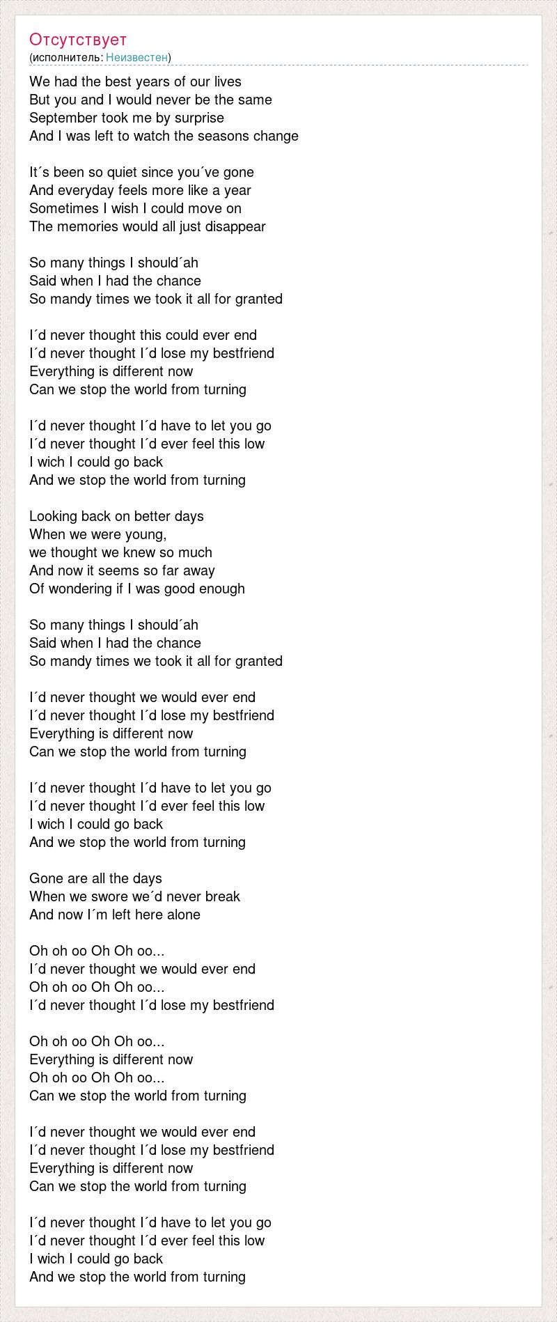 We had the best years of our lives But you and I would never be the same September took me by surprise And I was left to watch the seasons change It´s been so quiet since you´ve gone And everyday feels more like a year Sometimes I wish I could move on The memories would all just disappear So many things I should´ah Said when I had the chance So mandy times we took it all for granted I´d never thought this could ever end I´d never thought I´d lose my bestfriend Everything is different now Can we stop the world from turning I´d never thought I´d have to let you go I´d never thought I´d ever feel this low I wich I could go back And we stop the world from turning Looking back on better days When we were young, we thought we knew so much And now it seems so far away Of wondering if I was good enough So many things I should´ah Said when I had the chance So mandy times we took it all for granted I´d never thought we would ever end I´d never thought I´d lose my bestfriend Everything is different now Can we stop the world from turning I´d never thought I´d have to let you go I´d never thought I´d ever feel this low I wich I could go back And we stop the world from turning Gone are all the days When we swore we´d never break And now I´m left here alone Oh oh oo Oh Oh oo... I´d never thought we would ever end Oh oh oo Oh Oh oo... I´d never thought I´d lose my bestfriend Oh oh oo Oh Oh oo... Everything is different now Oh oh oo Oh Oh oo... Can we stop the world from turning I´d never thought we would ever end I´d never thought I´d lose my bestfriend Everything is different now Can we stop the world from turning I´d never thought I´d have to let you go I´d never thought I´d ever feel this low I wich I could go back And we stop the world from turning