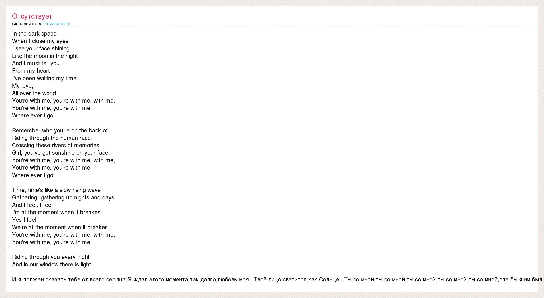 In the dark space When I close my eyes I see your face shining Like the moon in the night And I must tell you From my heart I've been waiting my time My love, All over the world You're with me, you're with me, with me, You're with me, you're with me Where ever I go Remember who you're on the back of Riding through the human race Crossing these rivers of memories Girl, you've got sunshine on your face You're with me, you're with me, with me, You're with me, you're with me Where ever I go Time, time's like a slow rising wave Gathering, gathering up nights and days And I feel, I feel I'm at the moment when it breakes Yes I feel We're at the moment when it breakes You're with me, you're with me, with me, You're with me, you're with me Riding through you every night And in our window there is light И я должен сказать тебе от всего сердца,Я ждал этого момента так долго,любовь моя...Твоё лицо светится,как Солнце...Ты со мной,ты со мной,ты со мной,ты со мной,ты со мной,где бы я ни был.
