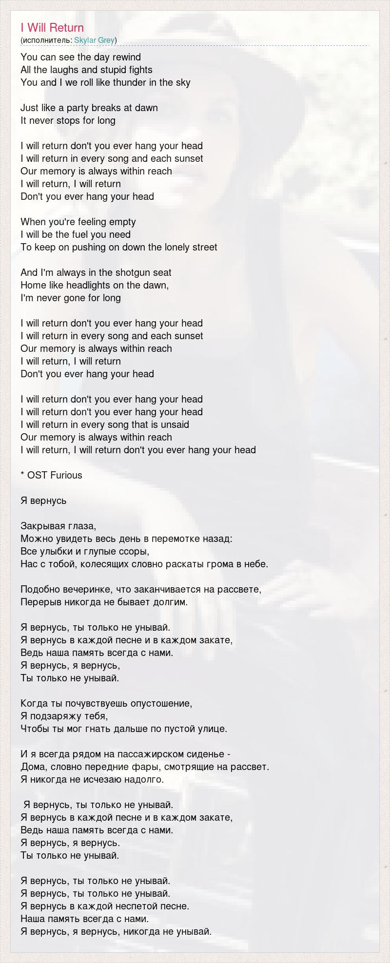 You can see the day rewind All the laughs and stupid fights You and I we roll like thunder in the sky Just like a party breaks at dawn It never stops for long I will return don't you ever hang your head I will return in every song and each sunset Our memory is always within reach I will return, I will return Don't you ever hang your head When you're feeling empty I will be the fuel you need To keep on pushing on down the lonely street And I'm always in the shotgun seat Home like headlights on the dawn, I'm never gone for long I will return don't you ever hang your head I will return in every song and each sunset Our memory is always within reach I will return, I will return Don't you ever hang your head I will return don't you ever hang your head I will return don't you ever hang your head I will return in every song that is unsaid Our memory is always within reach I will return, I will return don't you ever hang your head * OST Furious Я вернусь Закрывая глаза, Можно увидеть весь день в перемотке назад: Все улыбки и глупые ссоры, Нас с тобой, колесящих словно раскаты грома в небе. Подобно вечеринке, что заканчивается на рассвете, Перерыв никогда не бывает долгим. Я вернусь, ты только не унывай. Я вернусь в каждой песне и в каждом закате, Ведь наша память всегда с нами. Я вернусь, я вернусь, Ты только не унывай. Когда ты почувствуешь опустошение, Я подзаряжу тебя, Чтобы ты мог гнать дальше по пустой улице. И я всегда рядом на пассажирском сиденье - Дома, словно передние фары, смотрящие на рассвет. Я никогда не исчезаю надолго. Я вернусь, ты только не унывай. Я вернусь в каждой песне и в каждом закате, Ведь наша память всегда с нами. Я вернусь, я вернусь. Ты только не унывай. Я вернусь, ты только не унывай. Я вернусь, ты только не унывай. Я вернусь в каждой неспетой песне. Наша память всегда с нами. Я вернусь, я вернусь, никогда не унывай.