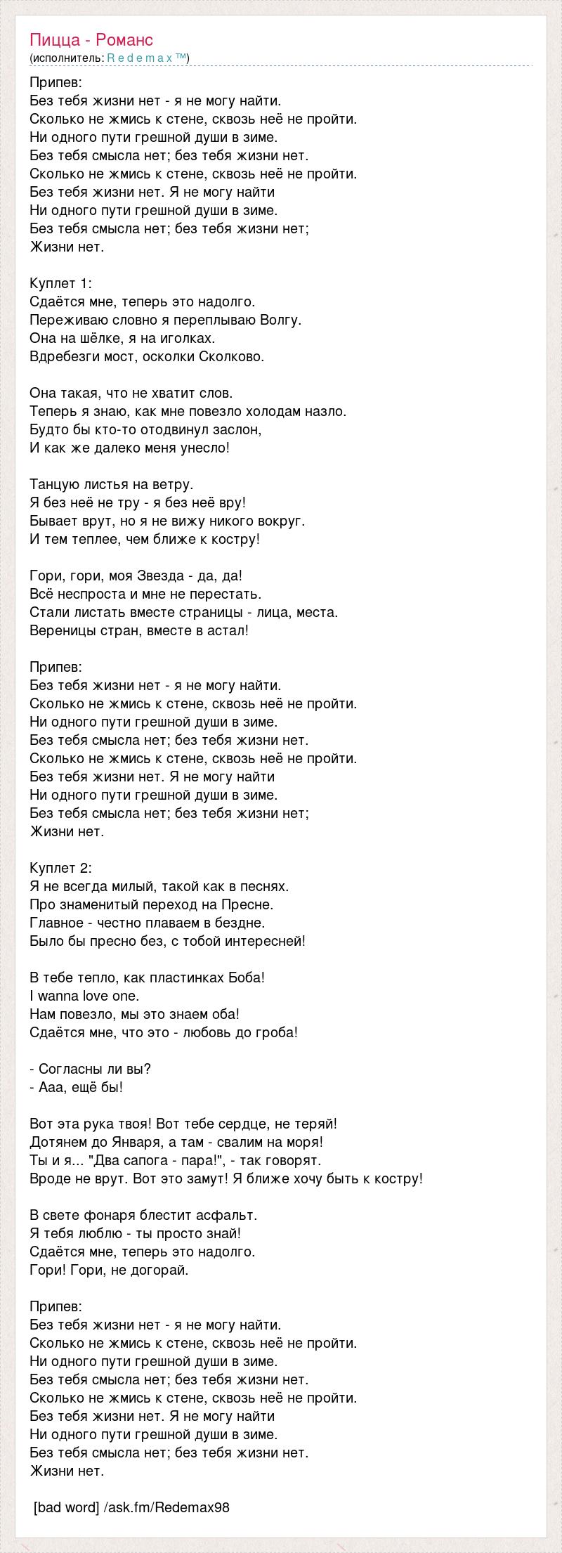 Припев: Без тебя жизни нет - я не могу найти. Сколько не жмись к стене, сквозь неё не пройти. Ни одного пути грешной души в зиме. Без тебя смысла нет; без тебя жизни нет. Сколько не жмись к стене, сквозь неё не пройти. Без тебя жизни нет. Я не могу найти Ни одного пути грешной души в зиме. Без тебя смысла нет; без тебя жизни нет; Жизни нет. Куплет 1: Сдаётся мне, теперь это надолго. Переживаю словно я переплываю Волгу. Она на шёлке, я на иголках. Вдребезги мост, осколки Сколково. Она такая, что не хватит слов. Теперь я знаю, как мне повезло холодам назло. Будто бы кто-то отодвинул заслон, И как же далеко меня унесло! Танцую листья на ветру. Я без неё не тру - я без неё вру! Бывает врут, но я не вижу никого вокруг. И тем теплее, чем ближе к костру! Гори, гори, моя Звезда - да, да! Всё неспроста и мне не перестать. Стали листать вместе страницы - лица, места. Вереницы стран, вместе в астал! Припев: Без тебя жизни нет - я не могу найти. Сколько не жмись к стене, сквозь неё не пройти. Ни одного пути грешной души в зиме. Без тебя смысла нет; без тебя жизни нет. Сколько не жмись к стене, сквозь неё не пройти. Без тебя жизни нет. Я не могу найти Ни одного пути грешной души в зиме. Без тебя смысла нет; без тебя жизни нет; Жизни нет. Куплет 2: Я не всегда милый, такой как в песнях. Про знаменитый переход на Пресне. Главное - честно плаваем в бездне. Было бы пресно без, с тобой интересней! В тебе тепло, как пластинках Боба! I wanna love one. Нам повезло, мы это знаем оба! Сдаётся мне, что это - любовь до гроба! - Согласны ли вы? - Ааа, ещё бы! Вот эта рука твоя! Вот тебе сердце, не теряй! Дотянем до Января, а там - свалим на моря! Ты и я... "Два сапога - пара!", - так говорят. Вроде не врут. Вот это замут! Я ближе хочу быть к костру! В свете фонаря блестит асфальт. Я тебя люблю - ты просто знай! Сдаётся мне, теперь это надолго. Гори! Гори, не догорай. Припев: Без тебя жизни нет - я не могу найти. Сколько не жмись к стене, сквозь неё не пройти. Ни одного пути грешной души в зиме. Без тебя смысла нет; без тебя жизни нет. Сколько не жмись к стене, сквозь неё не пройти. Без тебя жизни нет. Я не могу найти Ни одного пути грешной души в зиме. Без тебя смысла нет; без тебя жизни нет. Жизни нет. [bad word] /ask.fm/Redemax98