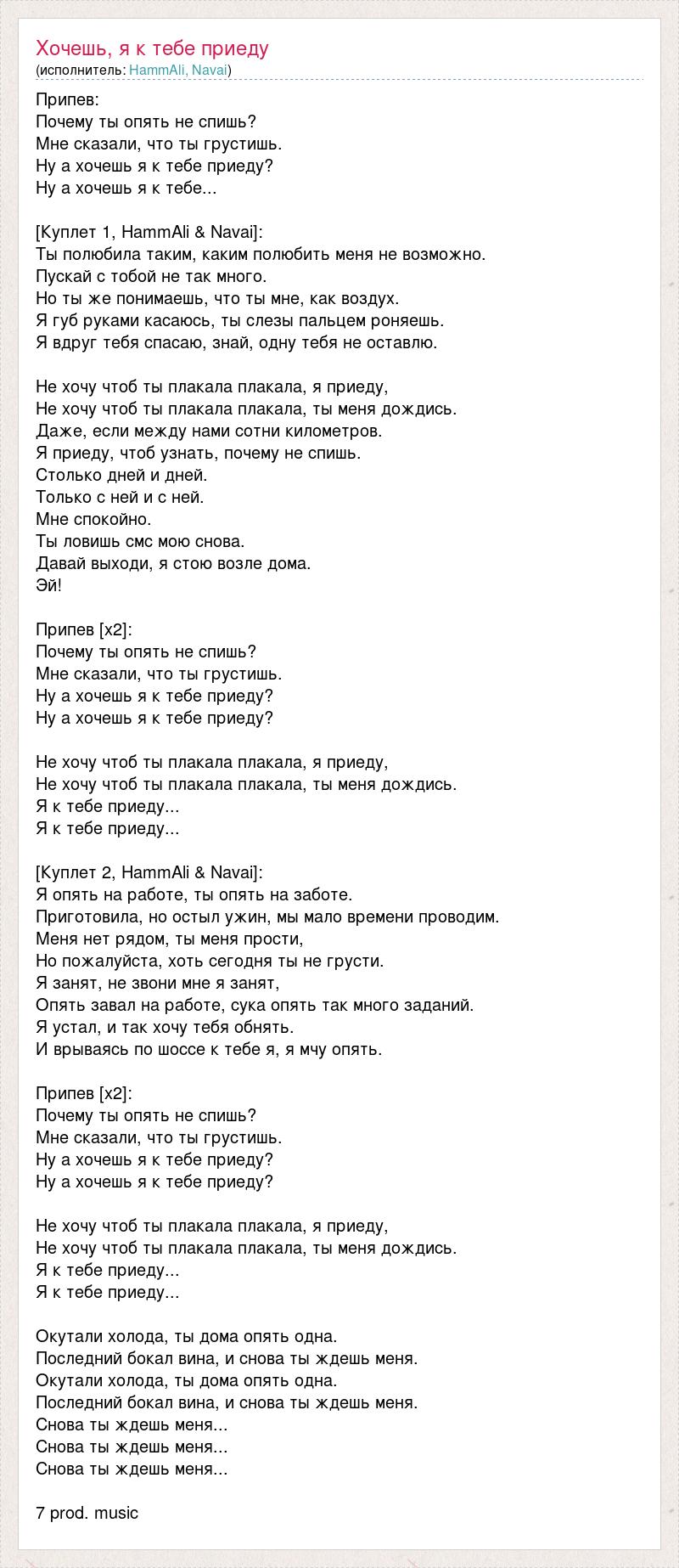 Припев: Почему ты опять не спишь? Мне сказали, что ты грустишь. Ну а хочешь я к тебе приеду? Ну а хочешь я к тебе... [Куплет 1, HammAli & Navai]: Ты полюбила таким, каким полюбить меня не возможно. Пускай с тобой не так много. Но ты же понимаешь, что ты мне, как воздух. Я губ руками касаюсь, ты слезы пальцем роняешь. Я вдруг тебя спасаю, знай, одну тебя не оставлю. Не хочу чтоб ты плакала плакала, я приеду, Не хочу чтоб ты плакала плакала, ты меня дождись. Даже, если между нами сотни километров. Я приеду, чтоб узнать, почему не спишь. Столько дней и дней. Только с ней и с ней. Мне спокойно. Ты ловишь смс мою снова. Давай выходи, я стою возле дома. Эй! Припев [х2]: Почему ты опять не спишь? Мне сказали, что ты грустишь. Ну а хочешь я к тебе приеду? Ну а хочешь я к тебе приеду? Не хочу чтоб ты плакала плакала, я приеду, Не хочу чтоб ты плакала плакала, ты меня дождись. Я к тебе приеду... Я к тебе приеду... [Куплет 2, HammAli & Navai]: Я опять на работе, ты опять на заботе. Приготовила, но остыл ужин, мы мало времени проводим. Меня нет рядом, ты меня прости, Но пожалуйста, хоть сегодня ты не грусти. Я занят, не звони мне я занят, Опять завал на работе, сука опять так много заданий. Я устал, и так хочу тебя обнять. И врываясь по шоссе к тебе я, я мчу опять. Припев [х2]: Почему ты опять не спишь? Мне сказали, что ты грустишь. Ну а хочешь я к тебе приеду? Ну а хочешь я к тебе приеду? Не хочу чтоб ты плакала плакала, я приеду, Не хочу чтоб ты плакала плакала, ты меня дождись. Я к тебе приеду... Я к тебе приеду... Окутали холода, ты дома опять одна. Последний бокал вина, и снова ты ждешь меня. Окутали холода, ты дома опять одна. Последний бокал вина, и снова ты ждешь меня. Снова ты ждешь меня... Снова ты ждешь меня... Снова ты ждешь меня... 7 prod. music
