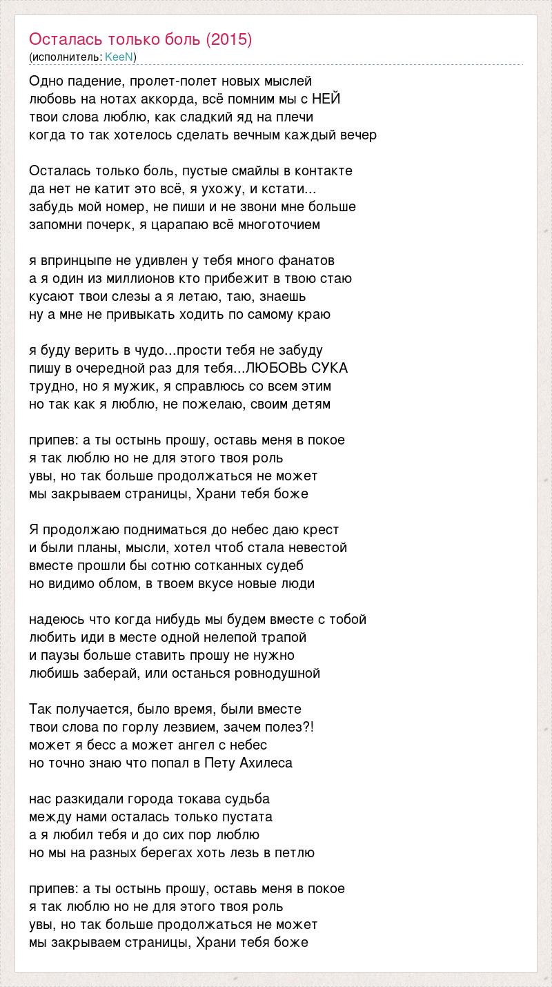 Одно падение, пролет-полет новых мыслей любовь на нотах аккорда, всё помним мы с НЕЙ твои слова люблю, как сладкий яд на плечи когда то так хотелось сделать вечным каждый вечер Осталась только боль, пустые смайлы в контакте да нет не катит это всё, я ухожу, и кстати... забудь мой номер, не пиши и не звони мне больше запомни почерк, я царапаю всё многоточием я впринцыпе не удивлен у тебя много фанатов а я один из миллионов кто прибежит в твою стаю кусают твои слезы а я летаю, таю, знаешь ну а мне не привыкать ходить по самому краю я буду верить в чудо...прости тебя не забуду пишу в очередной раз для тебя...ЛЮБОВЬ СУКА трудно, но я мужик, я справлюсь со всем этим но так как я люблю, не пожелаю, своим детям припев: а ты остынь прошу, оставь меня в покое я так люблю но не для этого твоя роль увы, но так больше продолжаться не может мы закрываем страницы, Храни тебя боже Я продолжаю подниматься до небес даю крест и были планы, мысли, хотел чтоб стала невестой вместе прошли бы сотню сотканных судеб но видимо облом, в твоем вкусе новые люди надеюсь что когда нибудь мы будем вместе с тобой любить иди в месте одной нелепой трапой и паузы больше ставить прошу не нужно любишь заберай, или останься ровнодушной Так получается, было время, были вместе твои слова по горлу лезвием, зачем полез?! может я бесс а может ангел с небес но точно знаю что попал в Пету Ахилеса нас разкидали города токава судьба между нами осталась только пустата а я любил тебя и до сих пор люблю но мы на разных берегах хоть лезь в петлю припев: а ты остынь прошу, оставь меня в покое я так люблю но не для этого твоя роль увы, но так больше продолжаться не может мы закрываем страницы, Храни тебя боже