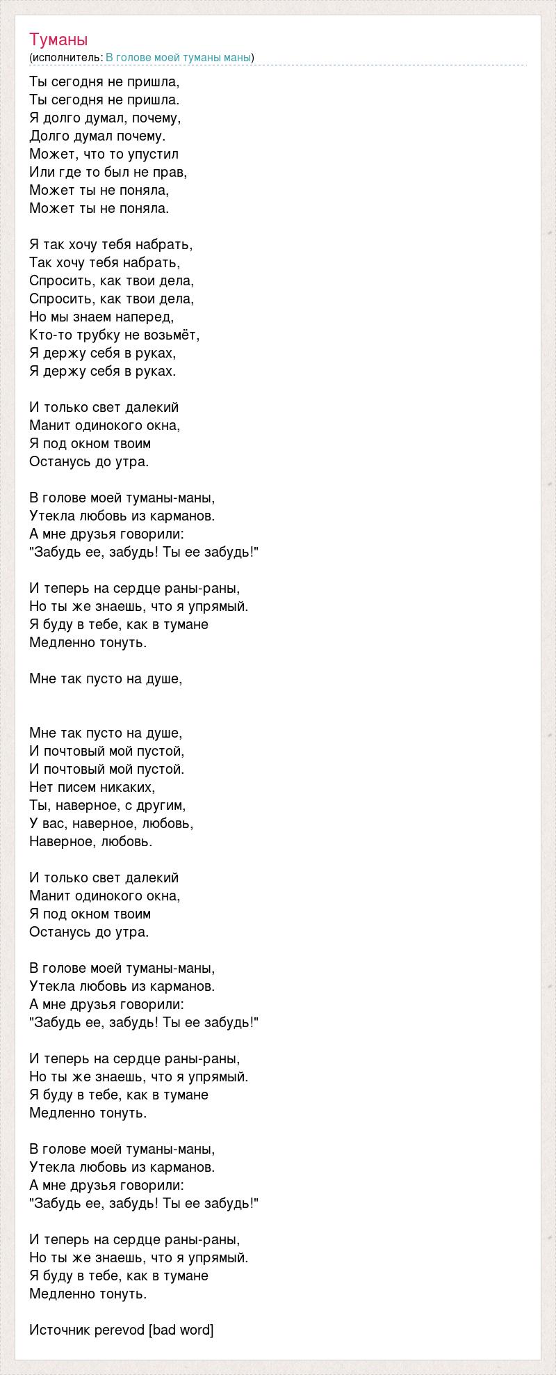 Ты сегодня не пришла, Ты сегодня не пришла. Я долго думал, почему, Долго думал почему. Может, что то упустил Или где то был не прав, Может ты не поняла, Может ты не поняла. Я так хочу тебя набрать, Так хочу тебя набрать, Спросить, как твои дела, Спросить, как твои дела, Но мы знаем наперед, Кто-то трубку не возьмёт, Я держу себя в руках, Я держу себя в руках. И только свет далекий Манит одинокого окна, Я под окном твоим Останусь до утра. В голове моей туманы-маны, Утекла любовь из карманов. А мне друзья говорили: "Забудь ее, забудь! Ты ее забудь!" И теперь на сердце раны-раны, Но ты же знаешь, что я упрямый. Я буду в тебе, как в тумане Медленно тонуть. Мне так пусто на душе, Мне так пусто на душе, И почтовый мой пустой, И почтовый мой пустой. Нет писем никаких, Ты, наверное, с другим, У вас, наверное, любовь, Наверное, любовь. И только свет далекий Манит одинокого окна, Я под окном твоим Останусь до утра. В голове моей туманы-маны, Утекла любовь из карманов. А мне друзья говорили: "Забудь ее, забудь! Ты ее забудь!" И теперь на сердце раны-раны, Но ты же знаешь, что я упрямый. Я буду в тебе, как в тумане Медленно тонуть. В голове моей туманы-маны, Утекла любовь из карманов. А мне друзья говорили: "Забудь ее, забудь! Ты ее забудь!" И теперь на сердце раны-раны, Но ты же знаешь, что я упрямый. Я буду в тебе, как в тумане Медленно тонуть. Источник perevod [bad word]