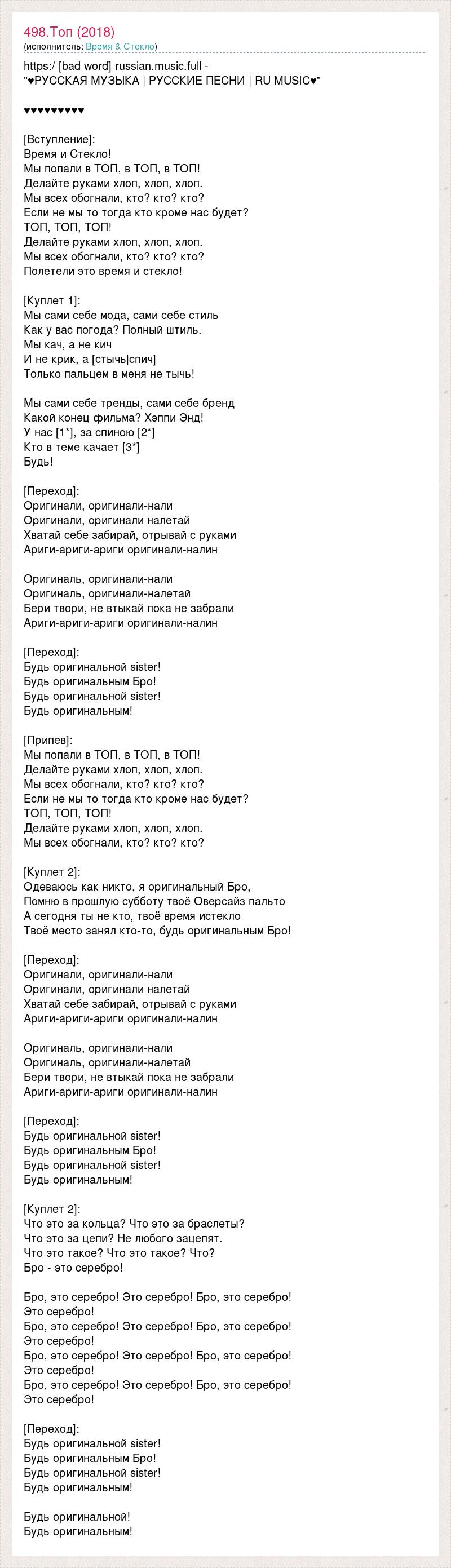 https:/ [bad word] russian.music.full - "♥РУССКАЯ МУЗЫКА | РУССКИЕ ПЕСНИ | RU MUSIC♥" ♥♥♥♥♥♥♥♥♥ [Вступление]: Время и Стекло! Мы попали в ТОП, в ТОП, в ТОП! Делайте руками хлоп, хлоп, хлоп. Мы всех обогнали, кто? кто? кто? Если не мы то тогда кто кроме нас будет? ТОП, ТОП, ТОП! Делайте руками хлоп, хлоп, хлоп. Мы всех обогнали, кто? кто? кто? Полетели это время и стекло! [Куплет 1]: Мы сами себе мода, сами себе стиль Как у вас погода? Полный штиль. Мы кач, а не кич И не крик, а [стычь|спич] Только пальцем в меня не тычь! Мы сами себе тренды, сами себе бренд Какой конец фильма? Хэппи Энд! У нас [1*], за спиною [2*] Кто в теме качает [3*] Будь! [Переход]: Оригинали, оригинали-нали Оригинали, оригинали налетай Хватай себе забирай, отрывай с руками Ариги-ариги-ариги оригинали-налин Оригиналь, оригинали-нали Оригиналь, оригинали-налетай Бери твори, не втыкай пока не забрали Ариги-ариги-ариги оригинали-налин [Переход]: Будь оригинальной sister! Будь оригинальным Бро! Будь оригинальной sister! Будь оригинальным! [Припев]: Мы попали в ТОП, в ТОП, в ТОП! Делайте руками хлоп, хлоп, хлоп. Мы всех обогнали, кто? кто? кто? Если не мы то тогда кто кроме нас будет? ТОП, ТОП, ТОП! Делайте руками хлоп, хлоп, хлоп. Мы всех обогнали, кто? кто? кто? [Куплет 2]: Одеваюсь как никто, я оригинальный Бро, Помню в прошлую субботу твоё Оверсайз пальто А сегодня ты не кто, твоё время истекло Твоё место занял кто-то, будь оригинальным Бро! [Переход]: Оригинали, оригинали-нали Оригинали, оригинали налетай Хватай себе забирай, отрывай с руками Ариги-ариги-ариги оригинали-налин Оригиналь, оригинали-нали Оригиналь, оригинали-налетай Бери твори, не втыкай пока не забрали Ариги-ариги-ариги оригинали-налин [Переход]: Будь оригинальной sister! Будь оригинальным Бро! Будь оригинальной sister! Будь оригинальным! [Куплет 2]: Что это за кольца? Что это за браслеты? Что это за цепи? Не любого зацепят. Что это такое? Что это такое? Что? Бро - это серебро! Бро, это серебро! Это серебро! Бро, это серебро! Это серебро! Бро, это серебро! Это серебро! Бро, это серебро! Это серебро! Бро, это серебро! Это серебро! Бро, это серебро! Это серебро! Бро, это серебро! Это серебро! Бро, это серебро! Это серебро! [Переход]: Будь оригинальной sister! Будь оригинальным Бро! Будь оригинальной sister! Будь оригинальным! Будь оригинальной! Будь оригинальным!