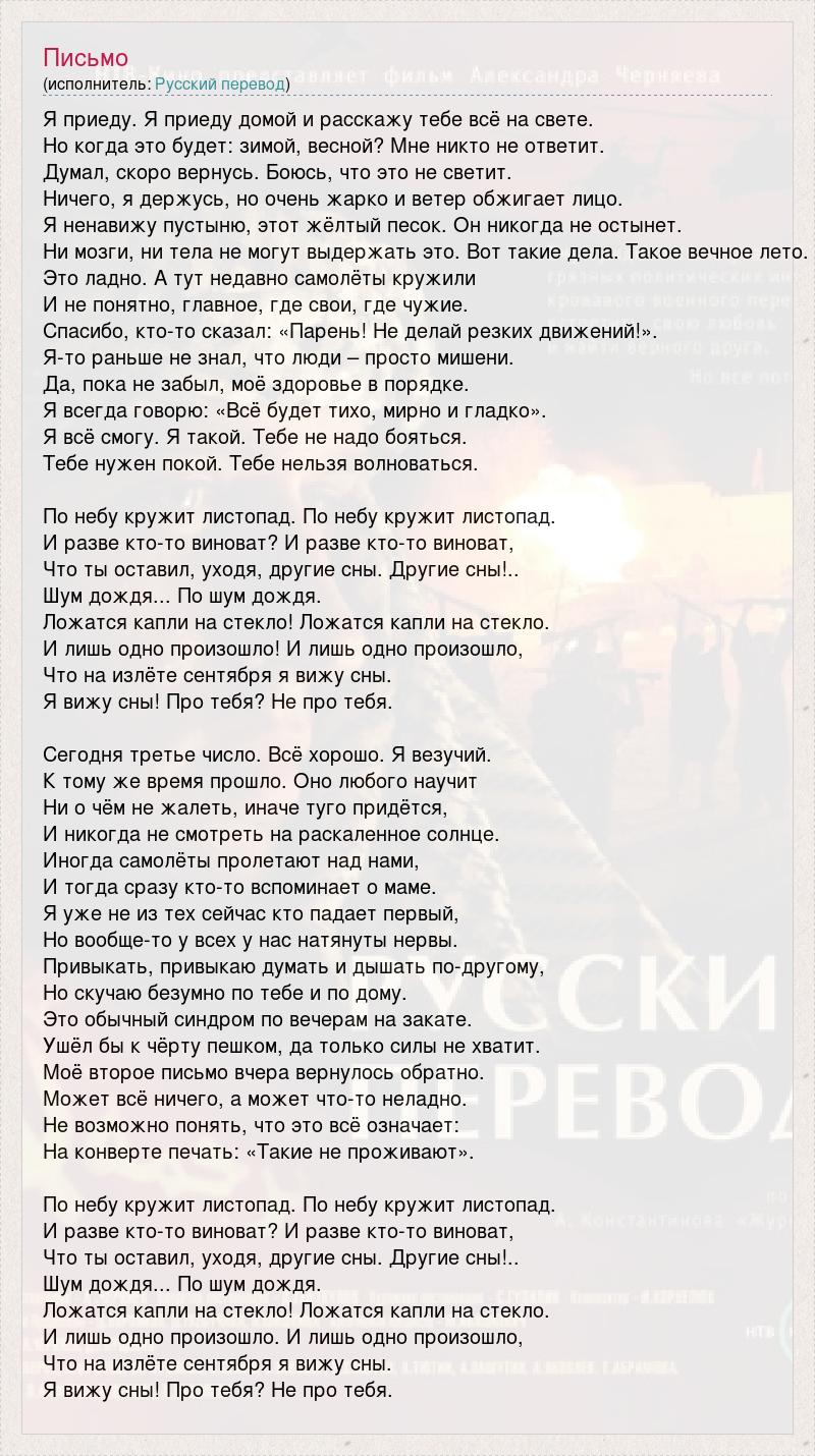 Я приеду. Я приеду домой и расскажу тебе всё на свете. Но когда это будет: зимой, весной? Мне никто не ответит. Думал, скоро вернусь. Боюсь, что это не светит. Ничего, я держусь, но очень жарко и ветер обжигает лицо. Я ненавижу пустыню, этот жёлтый песок. Он никогда не остынет. Ни мозги, ни тела не могут выдержать это. Вот такие дела. Такое вечное лето. Это ладно. А тут недавно самолёты кружили И не понятно, главное, где свои, где чужие. Спасибо, кто-то сказал: «Парень! Не делай резких движений!». Я-то раньше не знал, что люди – просто мишени. Да, пока не забыл, моё здоровье в порядке. Я всегда говорю: «Всё будет тихо, мирно и гладко». Я всё смогу. Я такой. Тебе не надо бояться. Тебе нужен покой. Тебе нельзя волноваться. По небу кружит листопад. По небу кружит листопад. И разве кто-то виноват? И разве кто-то виноват, Что ты оставил, уходя, другие сны. Другие сны!.. Шум дождя... По шум дождя. Ложатся капли на стекло! Ложатся капли на стекло. И лишь одно произошло! И лишь одно произошло, Что на излёте сентября я вижу сны. Я вижу сны! Про тебя? Не про тебя. Сегодня третье число. Всё хорошо. Я везучий. К тому же время прошло. Оно любого научит Ни о чём не жалеть, иначе туго придётся, И никогда не смотреть на раскаленное солнце. Иногда самолёты пролетают над нами, И тогда сразу кто-то вспоминает о маме. Я уже не из тех сейчас кто падает первый, Но вообще-то у всех у нас натянуты нервы. Привыкать, привыкаю думать и дышать по-другому, Но скучаю безумно по тебе и по дому. Это обычный синдром по вечерам на закате. Ушёл бы к чёрту пешком, да только силы не хватит. Моё второе письмо вчера вернулось обратно. Может всё ничего, а может что-то неладно. Не возможно понять, что это всё означает: На конверте печать: «Такие не проживают». По небу кружит листопад. По небу кружит листопад. И разве кто-то виноват? И разве кто-то виноват, Что ты оставил, уходя, другие сны. Другие сны!.. Шум дождя... По шум дождя. Ложатся капли на стекло! Ложатся капли на стекло. И лишь одно произошло. И лишь одно произошло, Что на излёте сентября я вижу сны. Я вижу сны! Про тебя? Не про тебя.