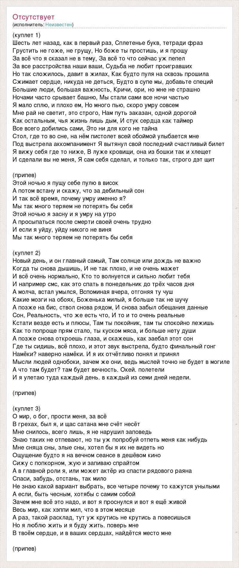 (куплет 1) Шесть лет назад, как в первый раз, Сплетенье букв, тетради фраз Грустить не гоже, не грущу, Но боже ты простишь, и я прощу За всё что я сказал не в тему, За всё то что сейчас уж пепел За все расстройства наши ваши, Судьба не любит проигравших Но так сложилось, давит в жилах, Как будто пуля на сквозь прошила Сжимает сердце, никуда не деться, Будто в супе мы, добавьте специй Большие люди, большая важность, Кричи, ори, но мне не страшно Ночами часто срывает башню, Мы стали сами все ночи частью Я мало сплю, и плохо ем, Но много пью, скоро умру совсем Мне рай не светит, это строго, Нам путь заказан, одной дорогой Как остальным, чья жизнь лишь дым, И стук сердца как таймер Все всего добились сами, Это ни для кого не тайна Стол, где то во сне, на нём пистолет всей обоймой улыбается мне Под выстрела аккомпанимент Я вытянул свой последний счастливый билет Я вижу себя где то ниже, В луже кровищи, она из бошки так и хлещет И сделали вы не меня, Я сам себя сделал, и только так, строго дэт щит (припев) Этой ночью я пущу себе пулю в висок А потом встану и скажу, что за дебильный сон И так всё время, почему умру именно я? Мы так много теряем не потерять бы себя Этой ночью я засну и я умру на утро А просыпаться после смерти своей очень трудно И если я уйду, уйду никого не виня Мы так много теряем не потерять бы себя (куплет 2) Новый день, и он главный самый, Там солнце или дождь не важно Когда ты снова дышишь, И не так плохо, и не очень мажет И всё очень нормально, Кто то волнуется и сильно любит тебя И например смс, как это спать в понедельник до трёх часов дня А молча, встал умылся, Вспоминая вчера, отгоняя ту чуш Какие мозги на обоях, Боженька милый, я больше так не шучу А позже на бис, ствол снова рядом, И снова забыл обещания данные Сон, Реальность, что же есть что, И то и то очень реальные Кстати везде есть и плюсы, Там ты покойник, там ты спокойно лежишь Как то попроще прям стало, ты куском мяса, и больше нету души А позже снова откроешь глаза, и скажешь, как заебал этот сон Где ты сидишь, всё плохо, и этот звук выстрела, будто финальный гонг Намёки? наверно намёки. И я их отчётливо понял и принял Мысли людей однобоки, зачем же они, ведь мыслей точно не будет в могиле А что там будет? там будет вечность. Окей. полетели И я улетаю туда каждый день. в каждый из семи дней недели. (припев) (куплет 3) О мир, о бог, прости меня, за всё В грехах, был я, и щас сатана мне счёт несёт Мне снилось, всего лишь, я не нарушил заповедь Знаю таких не отпевают, но ты уж попробуй отпеть меня как нибудь Мне сняца сны, злые сны, хотел бы я их не видеть но Ощущение будто я на вечном сеансе в дешёвом кино Сижу с попкорном, жую и запиваю спрайтом А в главной роли я, или может актёр из спасти рядового раяна Спаси, забудь, отстань, так мило Не знаю какой вариант выбрать, все четыре почему то кажутся унылыми А если, быть чесным, хотябы с самим собой Зачем мне всё это надо, и вот я проснулся и вот я ещё живой Весь мир, как хэппи мил, что в этом месяце А раз, такой расклад, тут уж крутись не крутись а повесишься Но я люблю жить и я буду жить. поверь мне В твоём сердце, и в ваших сердцах, найдётся место мне (припев)