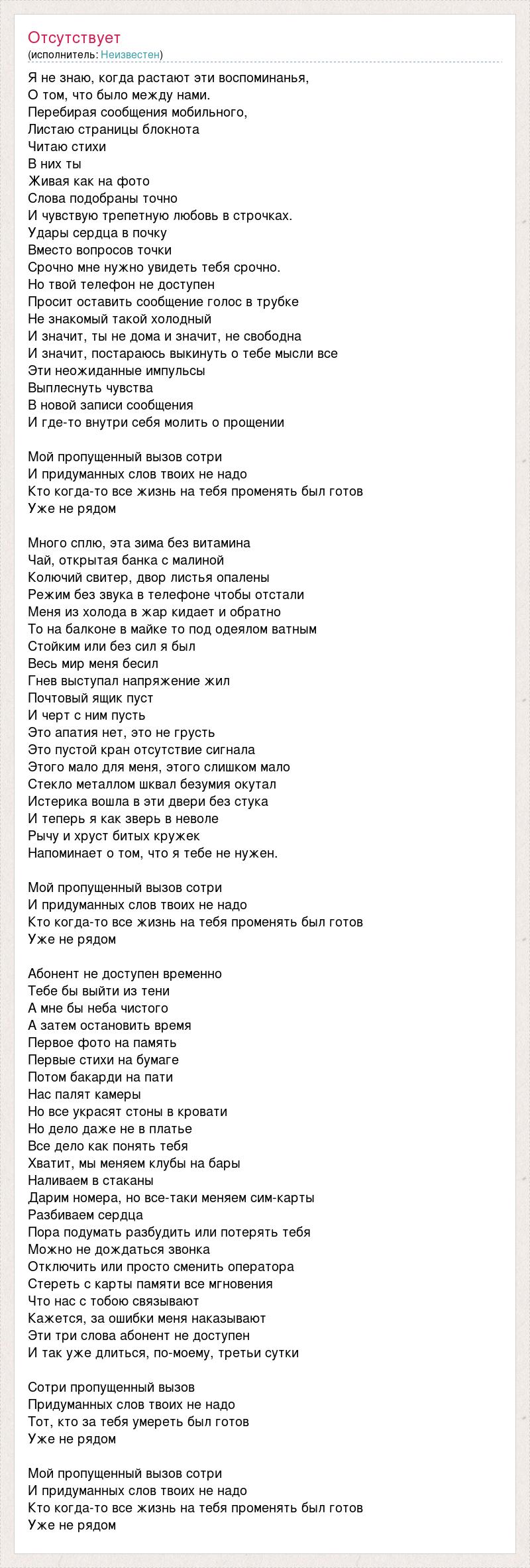 Я не знаю, когда растают эти воспоминанья, О том, что было между нами. Перебирая сообщения мобильного, Листаю страницы блокнота Читаю стихи В них ты Живая как на фото Слова подобраны точно И чувствую трепетную любовь в строчках. Удары сердца в почку Вместо вопросов точки Срочно мне нужно увидеть тебя срочно. Но твой телефон не доступен Просит оставить сообщение голос в трубке Не знакомый такой холодный И значит, ты не дома и значит, не свободна И значит, постараюсь выкинуть о тебе мысли все Эти неожиданные импульсы Выплеснуть чувства В новой записи сообщения И где-то внутри себя молить о прощении Мой пропущенный вызов сотри И придуманных слов твоих не надо Кто когда-то все жизнь на тебя променять был готов Уже не рядом Много сплю, эта зима без витамина Чай, открытая банка с малиной Колючий свитер, двор листья опалены Режим без звука в телефоне чтобы отстали Меня из холода в жар кидает и обратно То на балконе в майке то под одеялом ватным Стойким или без сил я был Весь мир меня бесил Гнев выступал напряжение жил Почтовый ящик пуст И черт с ним пусть Это апатия нет, это не грусть Это пустой кран отсутствие сигнала Этого мало для меня, этого слишком мало Стекло металлом шквал безумия окутал Истерика вошла в эти двери без стука И теперь я как зверь в неволе Рычу и хруст битых кружек Напоминает о том, что я тебе не нужен. Мой пропущенный вызов сотри И придуманных слов твоих не надо Кто когда-то все жизнь на тебя променять был готов Уже не рядом Абонент не доступен временно Тебе бы выйти из тени А мне бы неба чистого А затем остановить время Первое фото на память Первые стихи на бумаге Потом бакарди на пати Нас палят камеры Но все украсят стоны в кровати Но дело даже не в платье Все дело как понять тебя Хватит, мы меняем клубы на бары Наливаем в стаканы Дарим номера, но все-таки меняем сим-карты Разбиваем сердца Пора подумать разбудить или потерять тебя Можно не дождаться звонка Отключить или просто сменить оператора Стереть с карты памяти все мгновения Что нас с тобою связывают Кажется, за ошибки меня наказывают Эти три слова абонент не доступен И так уже длиться, по-моему, третьи сутки Сотри пропущенный вызов Придуманных слов твоих не надо Тот, кто за тебя умереть был готов Уже не рядом Мой пропущенный вызов сотри И придуманных слов твоих не надо Кто когда-то все жизнь на тебя променять был готов Уже не рядом