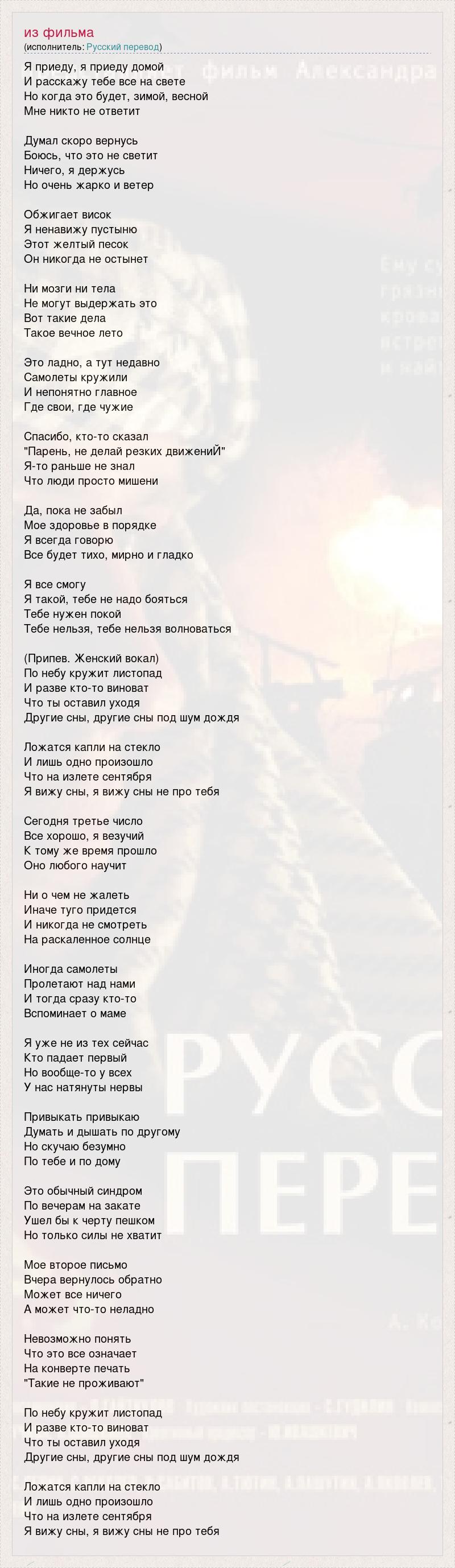 Я приеду, я приеду домой И расскажу тебе все на свете Но когда это будет, зимой, весной Мне никто не ответит Думал скоро вернусь Боюсь, что это не светит Ничего, я держусь Но очень жарко и ветер Обжигает висок Я ненавижу пустыню Этот желтый песок Он никогда не остынет Ни мозги ни тела Не могут выдержать это Вот такие дела Такое вечное лето Это ладно, a тут недавно Самолеты кружили И непонятно главное Где свои, где чужие Спасибо, кто-то сказал "Парень, не делай резких движениЙ" Я-то раньше не знал Что люди просто мишени Да, пока не забыл Мое здоровье в порядке Я всегда говорю Все будет тихо, мирно и гладко Я все смогу Я такой, тебе не надо бояться Тебе нужен покой Тебе нельзя, тебе нельзя волноваться (Припев. Женский вокал) По небу кружит листопад И разве кто-то виноват Что ты оставил уходя Другие сны, другие сны под шум дождя Ложатся капли на стекло И лишь одно произошло Что на излете сентября Я вижу сны, я вижу сны не про тебя Сегодня третье число Все хорошо, я везучий К тому же время прошло Оно любого научит Ни о чем не жалеть Иначе туго придется И никогда не смотреть На раскаленное солнце Иногда самолеты Пролетают над нами И тогда сразу кто-то Вспоминает о маме Я уже не из тех сейчас Кто падает первый Но вообще-то у всех У нас натянуты нервы Привыкать привыкаю Думать и дышать по другому Но скучаю безумно По тебе и по дому Это обычный синдром По вечерам на закате Ушел бы к черту пешком Но только силы не хватит Мое второе письмо Вчера вернулось обратно Может все ничего А может что-то неладно Невозможно понять Что это все означает На конверте печать "Такие не проживают" По небу кружит листопад И разве кто-то виноват Что ты оставил уходя Другие сны, другие сны под шум дождя Ложатся капли на стекло И лишь одно произошло Что на излете сентября Я вижу сны, я вижу сны не про тебя