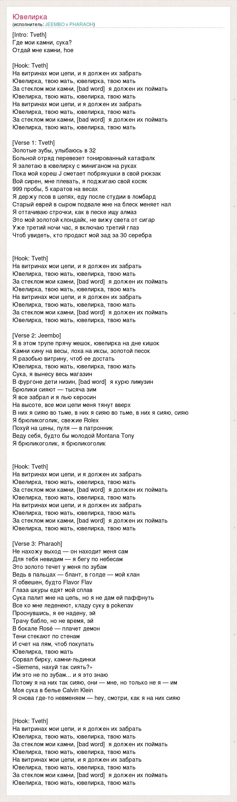 [Intro: Tveth] Где мои камни, сука? Отдай мне камни, hoe [Hook: Tveth] На витринах мои цепи, и я должен их забрать Ювелирка, твою мать, ювелирка, твою мать За стеклом мои камни, [bad word] я должен их поймать Ювелирка, твою мать, ювелирка, твою мать На витринах мои цепи, и я должен их забрать Ювелирка, твою мать, ювелирка, твою мать За стеклом мои камни, [bad word] я должен их поймать Ювелирка, твою мать, ювелирка, твою мать [Verse 1: Tveth] Золотые зубы, улыбаюсь в 32 Больной отряд перевезет тонированный катафалк Я залетаю в ювелирку с миниганом на руках Пока мой кореш J сметает побрякушки в свой рюкзак Вой сирен, мне плевать, я поджигаю свой косяк 999 пробы, 5 каратов на весах Я держу псов в цепях, еду после студии в ломбард Старый еврей в сыром подвале мне на блеск меняет нал Я оттачиваю строчки, как в песке ищу алмаз Это мой золотой клондайк, не вижу света от сигар Уже третий ночи час, я включаю третий глаз Чтоб увидеть, кто продаст мой зад за 30 серебра [Hook: Tveth] На витринах мои цепи, и я должен их забрать Ювелирка, твою мать, ювелирка, твою мать За стеклом мои камни, [bad word] я должен их поймать Ювелирка, твою мать, ювелирка, твою мать На витринах мои цепи, и я должен их забрать Ювелирка, твою мать, ювелирка, твою мать За стеклом мои камни, [bad word] я должен их поймать Ювелирка, твою мать, ювелирка, твою мать [Verse 2: Jeembo] Я в этом трупе прячу мешок, ювелирка на дне кишок Камни кину на весы, лоха на иксы, золотой песок Я разобью витрину, чтоб ее достать Ювелирка, твою мать, ювелирка, твою мать Сука, я вынесу весь магазин В фургоне дети низин, [bad word] я курю лимузин Брюлики сияют — тысяча зим Я все забрал и я лью керосин На высоте, все мои цепи меня тянут вверх В них я сияю во тьме, в них я сияю во тьме, в них я сияю, сияю Я брюликоголик, свежие Rolex Похуй на цены, пуля — в патронник Веду себя, будто бы молодой Montana Tony Я брюликоголик, я брюликоголик [Hook: Tveth] На витринах мои цепи, и я должен их забрать Ювелирка, твою мать, ювелирка, твою мать За стеклом мои камни, [bad word] я должен их поймать Ювелирка, твою мать, ювелирка, твою мать На витринах мои цепи, и я должен их забрать Ювелирка, твою мать, ювелирка, твою мать За стеклом мои камни, [bad word] я должен их поймать Ювелирка, твою мать, ювелирка, твою мать [Verse 3: Pharaoh] Не нахожу выход — он находит меня сам Для тебя невидим — я бегу по небесам Это золото течет у меня по зубам Ведь в пальцах — блант, в голде — мой клан Я обвешен, будто Flavor Flav Глаза шкуры едят мой сплав Сука палит мне на цепь, но я не дам ей паффнуть Все ко мне леденеют, кладу суку в pokenav Проснувшись, я ее надену, эй Трачу бабло, но не время, эй В бокале Rosé — плачет демон Тени стекают по стенам И счет на лям, чтоб покупать Ювелирка, твою мать Сорвал бирку, камни-льдинки «Siemens, нахуй так сиять?» Им это не по зубам... и я это знаю Потому я на них так сияю, они — мне, но только не я — им Моя сука в белье Calvin Klein Я снова где-то невменяем — hey, смотри, как я на них сияю [Hook: Tveth] На витринах мои цепи, и я должен их забрать Ювелирка, твою мать, ювелирка, твою мать За стеклом мои камни, [bad word] я должен их поймать Ювелирка, твою мать, ювелирка, твою мать На витринах мои цепи, и я должен их забрать Ювелирка, твою мать, ювелирка, твою мать За стеклом мои камни, [bad word] я должен их поймать Ювелирка, твою мать, ювелирка, твою мать