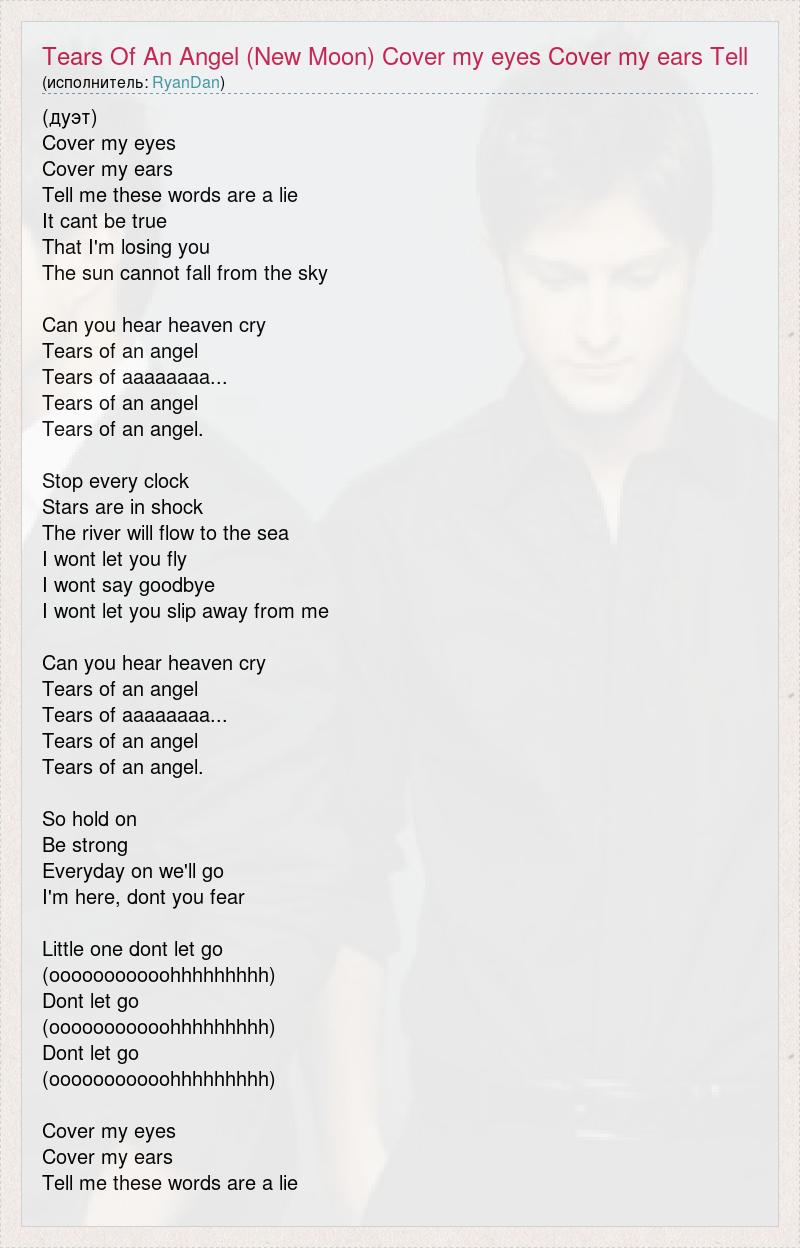 (дуэт) Cover my eyes Cover my ears Tell me these words are a lie It cant be true That I'm losing you The sun cannot fall from the sky Can you hear heaven cry Tears of an angel Tears of aaaaaaaa... Tears of an angel Tears of an angel. Stop every clock Stars are in shock The river will flow to the sea I wont let you fly I wont say goodbye I wont let you slip away from me Can you hear heaven cry Tears of an angel Tears of aaaaaaaa... Tears of an angel Tears of an angel. So hold on Be strong Everyday on we'll go I'm here, dont you fear Little one dont let go (ooooooooooohhhhhhhhh) Dont let go (ooooooooooohhhhhhhhh) Dont let go (ooooooooooohhhhhhhhh) Cover my eyes Cover my ears Tell me these words are a lie