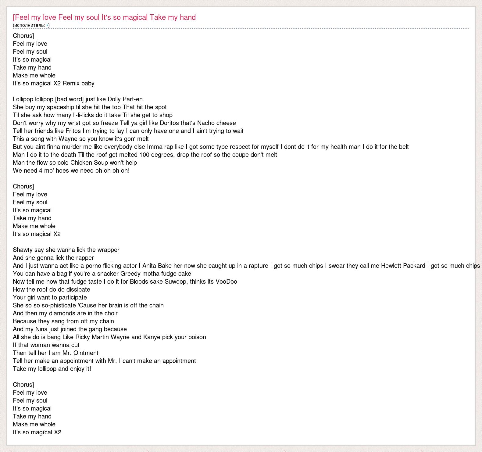Chorus] Feel my love Feel my soul It's so magical Take my hand Make me whole It's so magical X2 Remix baby Lollipop lollipop [bad word] just like Dolly Part-en She buy my spaceship til she hit the top That hit the spot Til she ask how many li-li-licks do it take Til she get to shop Don't worry why my wrist got so freeze Tell ya girl like Doritos that's Nacho cheese Tell her friends like Fritos I'm trying to lay I can only have one and I ain't trying to wait This a song with Wayne so you know it's gon' melt But you aint finna murder me like everybody else Imma rap like I got some type respect for myself I dont do it for my health man I do it for the belt Man I do it to the death Til the roof get melted 100 degrees, drop the roof so the coupe don't melt Man the flow so cold Chicken Soup won't help We need 4 mo' hoes we need oh oh oh oh! Chorus] Feel my love Feel my soul It's so magical Take my hand Make me whole It's so magical X2 Shawty say she wanna lick the wrapper And she gonna lick the rapper And I just wanna act like a porno flicking actor I Anita Bake her now she caught up in a rapture I got so much chips I swear they call me Hewlett Packard I got so much chips You can have a bag if you're a snacker Greedy motha fudge cake Now tell me how that fudge taste I do it for Bloods sake Suwoop, thinks its VooDoo How the roof do do dissipate Your girl want to participate She so so so-phisticate 'Cause her brain is off the chain And then my diamonds are in the choir Because they sang from off my chain And my Nina just joined the gang because All she do is bang Like Ricky Martin Wayne and Kanye pick your poison If that woman wanna cut Then tell her I am Mr. Ointment Tell her make an appointment with Mr. I can't make an appointment Take my lollipop and enjoy it! Chorus] Feel my love Feel my soul It's so magical Take my hand Make me whole It's so magïcal X2