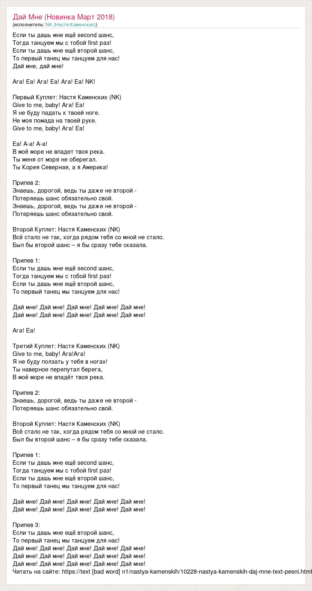 Если ты дашь мне ещё second шанс, Тогда танцуем мы с тобой first раз! Если ты дашь мне ещё второй шанс, То первый танец мы танцуем для нас! Дай мне, дай мне! Ага! Еа! Ага! Еа! Ага! Еа! NK! Первый Куплет: Настя Каменских (NK) Give to me, baby! Ага! Еа! Я не буду падать к твоей ноге. Не моя помада на твоей руке. Give to me, baby! Ага! Еа! Еа! А-а! А-а! В моё море не впадет твоя река. Ты меня от моря не оберегал. Ты Корея Северная, а я Америка! Припев 2: Знаешь, дорогой, ведь ты даже не второй - Потеряешь шанс обязательно свой. Знаешь, дорогой, ведь ты даже не второй - Потеряешь шанс обязательно свой. Второй Куплет: Настя Каменских (NK) Всё стало не так, когда рядом тебя со мной не стало. Был бы второй шанс – я бы сразу тебе сказала. Припев 1: Если ты дашь мне ещё second шанс, Тогда танцуем мы с тобой first раз! Если ты дашь мне ещё второй шанс, То первый танец мы танцуем для нас! Дай мне! Дай мне! Дай мне! Дай мне! Дай мне! Дай мне! Дай мне! Дай мне! Дай мне! Дай мне! Ага! Еа! Третий Куплет: Настя Каменских (NK) Give to me, baby! Ага!Ага! Я не буду ползать у тебя в ногах! Ты наверное перепутал берега, В моё море не впадёт твоя река. Припев 2: Знаешь, дорогой, ведь ты даже не второй - Потеряешь шанс обязательно свой. Второй Куплет: Настя Каменских (NK) Всё стало не так, когда рядом тебя со мной не стало. Был бы второй шанс – я бы сразу тебе сказала. Припев 1: Если ты дашь мне ещё second шанс, Тогда танцуем мы с тобой first раз! Если ты дашь мне ещё второй шанс, То первый танец мы танцуем для нас! Дай мне! Дай мне! Дай мне! Дай мне! Дай мне! Дай мне! Дай мне! Дай мне! Дай мне! Дай мне! Припев 3: Если ты дашь мне ещё второй шанс, То первый танец мы танцуем для нас! Дай мне! Дай мне! Дай мне! Дай мне! Дай мне! Дай мне! Дай мне! Дай мне! Дай мне! Дай мне! Дай мне! Дай мне! Дай мне! Дай мне! Дай мне! Читать на сайте: https://text [bad word] n1/nastya-kamenskih/10228-nastya-kamenskih-daj-mne-text-pesni.html