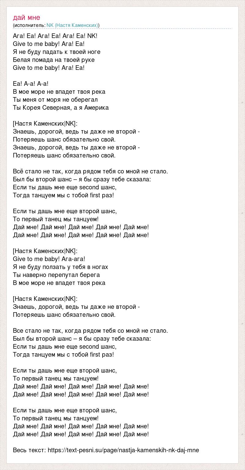 Ага! Еа! Ага! Еа! Ага! Еа! NK! Give to me baby! Ага! Еа! Я не буду падать к твоей ноге Белая помада на твоей руке Give to me baby! Ага! Еа! Еа! А-а! А-а! В мое море не впадет твоя река Ты меня от моря не оберегал Ты Корея Северная, а я Америка [Настя Каменских|NK]: Знаешь, дорогой, ведь ты даже не второй - Потеряешь шанс обязательно свой. Знаешь, дорогой, ведь ты даже не второй - Потеряешь шанс обязательно свой. Всё стало не так, когда рядом тебя со мной не стало. Был бы второй шанс – я бы сразу тебе сказала: Если ты дашь мне еще second шанс, Тогда танцуем мы с тобой first раз! Если ты дашь мне еще второй шанс, То первый танец мы танцуем! Дай мне! Дай мне! Дай мне! Дай мне! Дай мне! Дай мне! Дай мне! Дай мне! Дай мне! Дай мне! [Настя Каменских|NK]: Give to me baby! Ага-ага! Я не буду ползать у тебя в ногах Ты наверно перепутал берега В мое море не впадет твоя река [Настя Каменских|NK]: Знаешь, дорогой, ведь ты даже не второй - Потеряешь шанс обязательно свой. Все стало не так, когда рядом тебя со мной не стало. Был бы второй шанс – я бы сразу тебе сказала: Если ты дашь мне еще second шанс, Тогда танцуем мы с тобой first раз! Если ты дашь мне еще второй шанс, То первый танец мы танцуем! Дай мне! Дай мне! Дай мне! Дай мне! Дай мне! Дай мне! Дай мне! Дай мне! Дай мне! Дай мне! Если ты дашь мне еще второй шанс, То первый танец мы танцуем! Дай мне! Дай мне! Дай мне! Дай мне! Дай мне! Дай мне! Дай мне! Дай мне! Дай мне! Дай мне! Весь текст: https://text-pesni.su/page/nastja-kamenskih-nk-daj-mne