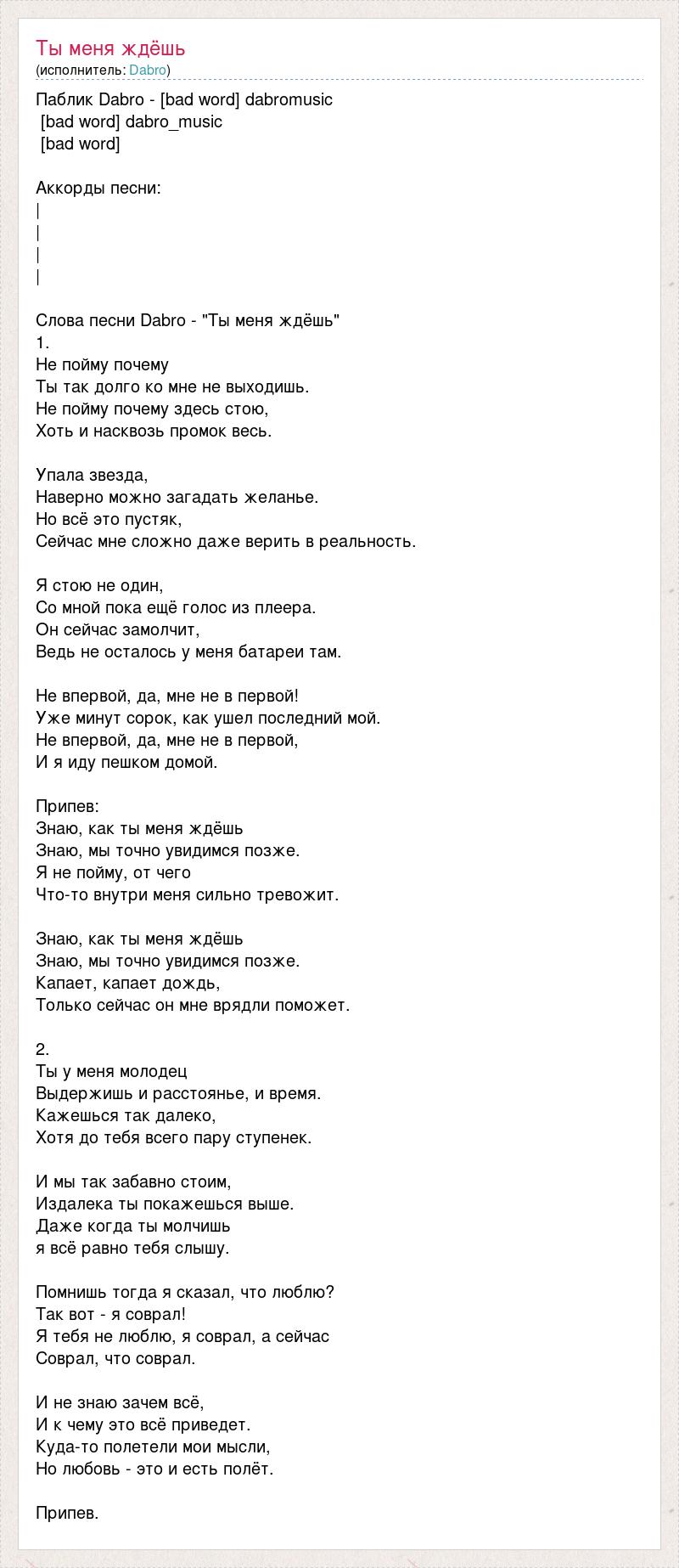 Паблик Dabro - [bad word] dabromusic [bad word] dabro_music [bad word] Аккорды песни: | | | | Слова песни Dabro - "Ты меня ждёшь" 1. Не пойму почему Ты так долго ко мне не выходишь. Не пойму почему здесь стою, Хоть и насквозь промок весь. Упала звезда, Наверно можно загадать желанье. Но всё это пустяк, Сейчас мне сложно даже верить в реальность. Я стою не один, Со мной пока ещё голос из плеера. Он сейчас замолчит, Ведь не осталось у меня батареи там. Не впервой, да, мне не в первой! Уже минут сорок, как ушел последний мой. Не впервой, да, мне не в первой, И я иду пешком домой. Припев: Знаю, как ты меня ждёшь Знаю, мы точно увидимся позже. Я не пойму, от чего Что-то внутри меня сильно тревожит. Знаю, как ты меня ждёшь Знаю, мы точно увидимся позже. Капает, капает дождь, Только сейчас он мне врядли поможет. 2. Ты у меня молодец Выдержишь и расстоянье, и время. Кажешься так далеко, Хотя до тебя всего пару ступенек. И мы так забавно стоим, Издалека ты покажешься выше. Даже когда ты молчишь я всё равно тебя слышу. Помнишь тогда я сказал, что люблю? Так вот - я соврал! Я тебя не люблю, я соврал, а сейчас Соврал, что соврал. И не знаю зачем всё, И к чему это всё приведет. Куда-то полетели мои мысли, Но любовь - это и есть полёт. Припев.
