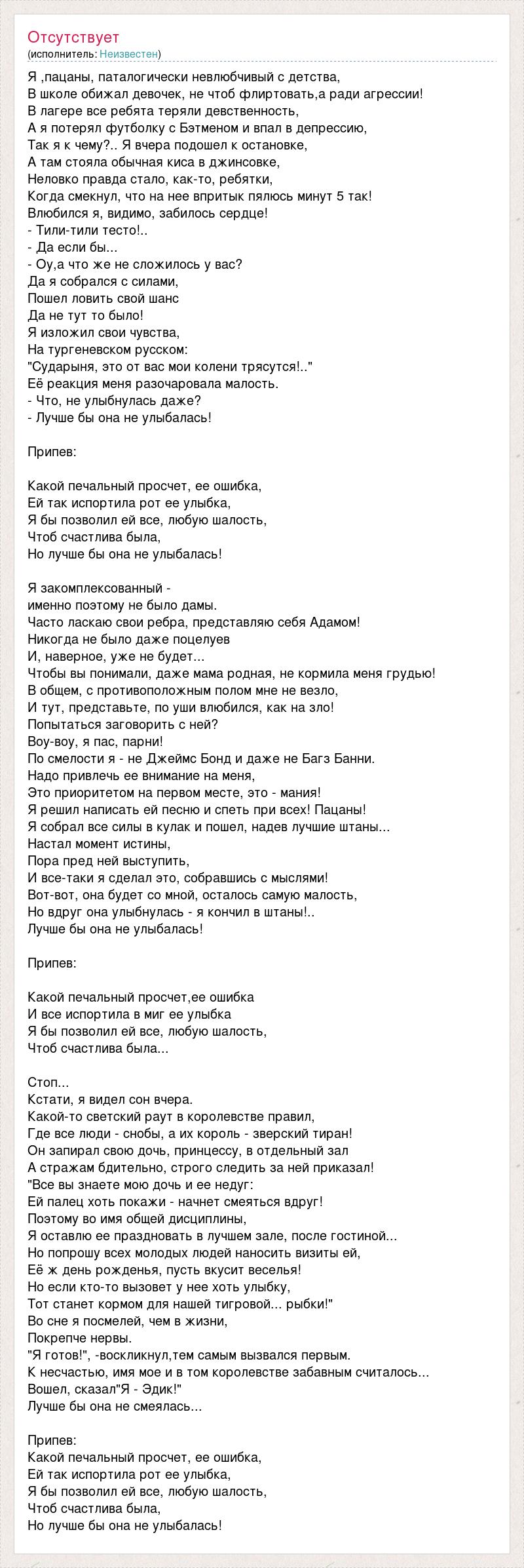 Я ,пацаны, паталогически невлюбчивый с детства, В школе обижал девочек, не чтоб флиртовать,а ради агрессии! В лагере все ребята теряли девственность, А я потерял футболку с Бэтменом и впал в депрессию, Так я к чему?.. Я вчера подошел к остановке, А там стояла обычная киса в джинсовке, Неловко правда стало, как-то, ребятки, Когда смекнул, что на нее впритык пялюсь минут 5 так! Влюбился я, видимо, забилось сердце! - Тили-тили тесто!.. - Да если бы... - Оу,а что же не сложилось у вас? Да я собрался с силами, Пошел ловить свой шанс Да не тут то было! Я изложил свои чувства, На тургеневском русском: "Сударыня, это от вас мои колени трясутся!.." Её реакция меня разочаровала малость. - Что, не улыбнулась даже? - Лучше бы она не улыбалась! Припев: Какой печальный просчет, ее ошибка, Ей так испортила рот ее улыбка, Я бы позволил ей все, любую шалость, Чтоб счастлива была, Но лучше бы она не улыбалась! Я закомплексованный - именно поэтому не было дамы. Часто ласкаю свои ребра, представляю себя Адамом! Никогда не было даже поцелуев И, наверное, уже не будет... Чтобы вы понимали, даже мама родная, не кормила меня грудью! В общем, с противоположным полом мне не везло, И тут, представьте, по уши влюбился, как на зло! Попытаться заговорить с ней? Воу-воу, я пас, парни! По смелости я - не Джеймс Бонд и даже не Багз Банни. Надо привлечь ее внимание на меня, Это приоритетом на первом месте, это - мания! Я решил написать ей песню и спеть при всех! Пацаны! Я собрал все силы в кулак и пошел, надев лучшие штаны... Настал момент истины, Пора пред ней выступить, И все-таки я сделал это, собравшись с мыслями! Вот-вот, она будет со мной, осталось самую малость, Но вдруг она улыбнулась - я кончил в штаны!.. Лучше бы она не улыбалась! Припев: Какой печальный просчет,ее ошибка И все испортила в миг ее улыбка Я бы позволил ей все, любую шалость, Чтоб счастлива была... Стоп... Кстати, я видел сон вчера. Какой-то светский раут в королевстве правил, Где все люди - снобы, а их король - зверский тиран! Он запирал свою дочь, принцессу, в отдельный зал А стражам бдительно, строго следить за ней приказал! "Все вы знаете мою дочь и ее недуг: Ей палец хоть покажи - начнет смеяться вдруг! Поэтому во имя общей дисциплины, Я оставлю ее праздновать в лучшем зале, после гостиной... Но попрошу всех молодых людей наносить визиты ей, Её ж день рожденья, пусть вкусит веселья! Но если кто-то вызовет у нее хоть улыбку, Тот станет кормом для нашей тигровой... рыбки!" Во сне я посмелей, чем в жизни, Покрепче нервы. "Я готов!", -воскликнул,тем самым вызвался первым. К несчастью, имя мое и в том королевстве забавным считалось... Вошел, сказал"Я - Эдик!" Лучше бы она не смеялась... Припев: Какой печальный просчет, ее ошибка, Ей так испортила рот ее улыбка, Я бы позволил ей все, любую шалость, Чтоб счастлива была, Но лучше бы она не улыбалась!