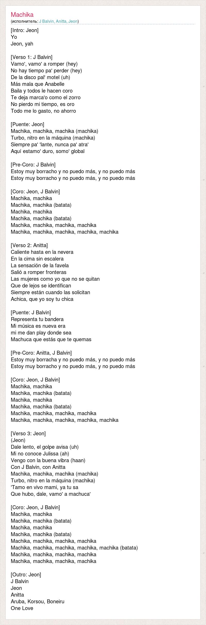 [Intro: Jeon] Yo Jeon, yah [Verso 1: J Balvin] Vamo', vamo' a romper (hey) No hay tiempo pa' perder (hey) De la disco pal' motel (uh) Más mala que Anabelle Baila y todos le hacen coro Te deja marca'o como el zorro No pierdo mi tiempo, es oro Todo me lo gasto, no ahorro [Puente: Jeon] Machika, machika, machika (machika) Turbo, nitro en la máquina (machika) Siempre pa' 'lante, nunca pa' atra' Aquí estamo' duro, somo' global [Pre-Coro: J Balvin] Estoy muy borracho y no puedo más, y no puedo más Estoy muy borracho y no puedo más, y no puedo más [Coro: Jeon, J Balvin] Machika, machika Machika, machika (batata) Machika, machika Machika, machika (batata) Machika, machika, machika, machika Machika, machika, machika, machika, machika [Verso 2: Anitta] Caliente hasta en la nevera En la cima sin escalera La sensación de la favela Salió a romper fronteras Las mujeres como yo que no se quitan Que de lejos se identifican Siempre están cuando las solicitan Achica, que yo soy tu chica [Puente: J Balvin] Representa tu bandera Mi música es nueva era mi me dan play donde sea Machuca que estás que te quemas [Pre-Coro: Anitta, J Balvin] Estoy muy borracha y no puedo más, y no puedo más Estoy muy borracho y no puedo más, y no puedo más [Coro: Jeon, J Balvin] Machika, machika Machika, machika (batata) Machika, machika Machika, machika (batata) Machika, machika, machika, machika Machika, machika, machika, machika, machika [Verso 3: Jeon] (Jeon) Dale lento, el golpe avisa (uh) Mi no conoce Julissa (ah) Vengo con la buena vibra (haan) Con J Balvin, con Anitta Machika, machika, machika (machika) Turbo, nitro en la máquina (machika) 'Tamo en vivo mami, ya tu sa Que hubo, dale, vamo' a machuca' [Coro: Jeon, J Balvin] Machika, machika Machika, machika (batata) Machika, machika Machika, machika (batata) Machika, machika, machika, machika Machika, machika, machika, machika, machika (batata) Machika, machika, machika, machika Machika, machika, machika, machika [Outro: Jeon] J Balvin Jeon Anitta Aruba, Korsou, Boneiru One Love