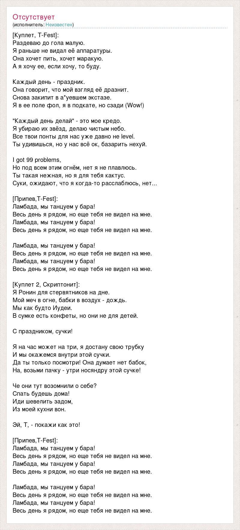 [Куплет, T-Fest]: Раздеваю до гола малую. Я раньше не видал её аппаратуры. Она хочет пить, хочет маракую. А я хочу ее, если хочу, то буду. Каждый день - праздник. Она говорит, что мой взгляд её дразнит. Снова закипит в а*уевшем экстазе. Я в ее поле фол, я в подкате, но сзади (Wow!) "Каждый день делай" - это мое кредо. Я убираю их звёзд, делаю чистым небо. Все твои понты для нас уже давно не level. Ты удивишься, но у нас всё ок, базарить нехуй. I got 99 problems, Но под всем этим огнём, нет я не плавлюсь. Ты такая нежная, но я для тебя кактус. Суки, ожидают, что я когда-то расслаблюсь, нет... [Припев,T-Fest]: Ламбада, мы танцуем у бара! Весь день я рядом, но еще тебя не видел на мне. Ламбада, мы танцуем у бара! Весь день я рядом, но еще тебя не видел на мне. Ламбада, мы танцуем у бара! Весь день я рядом, но еще тебя не видел на мне. Ламбада, мы танцуем у бара! Весь день я рядом, но еще тебя не видел на мне. [Куплет 2, Скриптонит]: Я Ронин для стервятников на дне. Мой меч в огне, бабки в воздух - дождь. Мы как будто Иудеи. В сумке есть конфеты, но они не для детей. С праздником, сучки! Я на час может на три, я достану свою трубку И мы окажемся внутри этой сучки. Да ты только посмотри! Она думает нет бабок, На, возьми пачку - утри носяндру этой сучке! Че они тут возомнили о себе? Спать будешь дома! Иди шевелить задом, Из моей кухни вон. Эй, Т, - покажи как это! [Припев,T-Fest]: Ламбада, мы танцуем у бара! Весь день я рядом, но еще тебя не видел на мне. Ламбада, мы танцуем у бара! Весь день я рядом, но еще тебя не видел на мне. Ламбада, мы танцуем у бара! Весь день я рядом, но еще тебя не видел на мне. Ламбада, мы танцуем у бара! Весь день я рядом, но еще тебя не видел на мне.