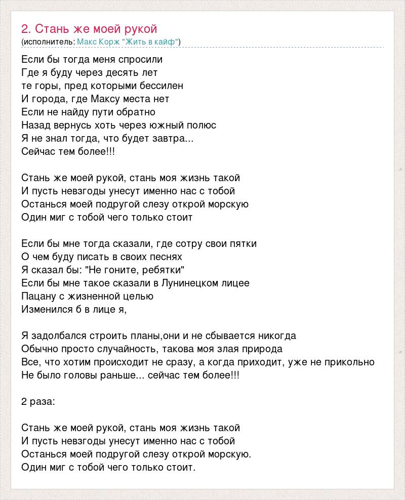 Если бы тогда меня спросили Где я буду через десять лет те горы, пред которыми бессилен И города, где Максу места нет Если не найду пути обратно Назад вернусь хоть через южный полюс Я не знал тогда, что будет завтра... Сейчас тем более!!! Стань же моей рукой, стань моя жизнь такой И пусть невзгоды унесут именно нас с тобой Останься моей подругой слезу открой морскую Один миг с тобой чего только стоит Если бы мне тогда сказали, где сотру свои пятки О чем буду писать в своих песнях Я сказал бы: "Не гоните, ребятки" Если бы мне такое сказали в Лунинецком лицее Пацану с жизненной целью Изменился б в лице я, Я задолбался строить планы,они и не сбывается никогда Обычно просто случайность, такова моя злая природа Все, что хотим происходит не сразу, а когда приходит, уже не прикольно Не было головы раньше... сейчас тем более!!! 2 раза: Стань же моей рукой, стань моя жизнь такой И пусть невзгоды унесут именно нас с тобой Останься моей подругой слезу открой морскую. Один миг с тобой чего только стоит.