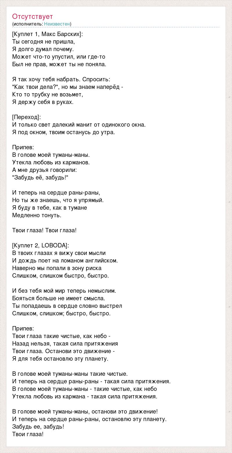 [Куплет 1, Макс Барских]: Ты сегодня не пришла, Я долго думал почему. Может что-то упустил, или где-то Был не прав, может ты не поняла. Я так хочу тебя набрать. Спросить: "Как твои дела?", но мы знаем наперёд - Кто то трубку не возьмет, Я держу себя в руках. [Переход]: И только свет далекий манит от одинокого окна. Я под окном, твоим останусь до утра. Припев: В голове моей туманы-маны. Утекла любовь из карманов. А мне друзья говорили: "Забудь её, забудь!" И теперь на сердце раны-раны, Но ты же знаешь, что я упрямый. Я буду в тебе, как в тумане Медленно тонуть. Твои глаза! Твои глаза! [Куплет 2, LOBODA]: В твоих глазах я вижу свои мысли И дождь поет на ломаном английском. Наверно мы попали в зону риска Слишком, слишком быстро, быстро. И без тебя мой мир теперь немыслим. Бояться больше не имеет смысла. Ты попадаешь в сердце словно выстрел Слишком, слишком; быстро, быстро. Припев: Твои глаза такие чистые, как небо - Назад нельзя, такая сила притяжения Твои глаза. Останови это движение - Я для тебя остановлю эту планету. В голове моей туманы-маны такие чистые. И теперь на сердце раны-раны - такая сила притяжения. В голове моей туманы-маны - такие чистые, как небо Утекла любовь из кармана - такая сила притяжения. В голове моей туманы-маны, останови это движение! И теперь на сердце раны-раны, остановлю эту планету. Забудь ее, забудь! Твои глаза!