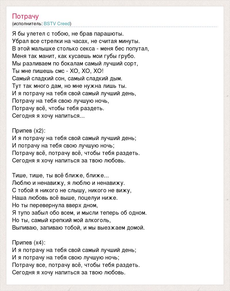 Я бы улетел с тобою, не брав парашюты. Убрал все стрелки на часах, не считая минуты. В этой малышке столько секса - меня бес попутал, Меня так манит, как кусаешь мои губы грубо. Мы разливаем по бокалам самый лучший сорт, Ты мне пишешь смс - XO, XO, XO! Самый сладкий сон, самый сладкий дым. Тут так много дам, но мне нужна лишь ты. И я потрачу на тебя свой самый лучший день, Потрачу на тебя свою лучшую ночь, Потрачу всё, чтобы тебя раздеть. Сегодня я хочу напиться... Припев (x2): И я потрачу на тебя свой самый лучший день; И потрачу на тебя свою лучшую ночь; Потрачу всё, потрачу всё, чтобы тебя раздеть. Сегодня я хочу напиться за твою любовь. Тише, тише, ты всё ближе, ближе... Люблю и ненавижу, я люблю и ненавижу. С тобой я никого не слышу, никого не вижу, Наша любовь всё выше, поцелуи ниже. Но ты перевернула вверх дном, Я тупо забыл обо всем, и мысли теперь об одном. Но ты, самый крепкий мой алкоголь, Выпиваю, запиваю тобой, и мы выезжаем домой. Припев (x4): И я потрачу на тебя свой самый лучший день; И я потрачу на тебя свою лучшую ночь; Потрачу все, потрачу всё, чтобы тебя раздеть. Сегодня я хочу напиться за твою любовь.