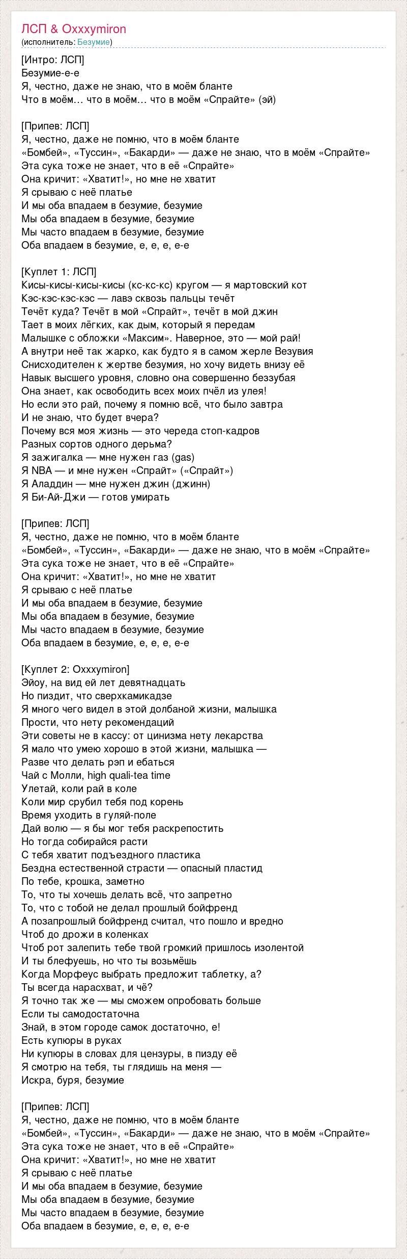 [Интро: ЛСП] Безумие-е-е Я, честно, даже не знаю, что в моём бланте Что в моём… что в моём… что в моём «Спрайте» (эй) [Припев: ЛСП] Я, честно, даже не помню, что в моём бланте «Бомбей», «Туссин», «Бакарди» — даже не знаю, что в моём «Спрайте» Эта сука тоже не знает, что в её «Спрайте» Она кричит: «Хватит!», но мне не хватит Я срываю с неё платье И мы оба впадаем в безумие, безумие Мы оба впадаем в безумие, безумие Мы часто впадаем в безумие, безумие Оба впадаем в безумие, е, е, е, е-е [Куплет 1: ЛСП] Кисы-кисы-кисы-кисы (кс-кс-кс) кругом — я мартовский кот Кэс-кэс-кэс-кэс — лавэ сквозь пальцы течёт Течёт куда? Течёт в мой «Спрайт», течёт в мой джин Тает в моих лёгких, как дым, который я передам Малышке с обложки «Максим». Наверное, это — мой рай! А внутри неё так жарко, как будто я в самом жерле Везувия Снисходителен к жертве безумия, но хочу видеть внизу её Навык высшего уровня, словно она совершенно беззубая Она знает, как освободить всех моих пчёл из улея! Но если это рай, почему я помню всё, что было завтра И не знаю, что будет вчера? Почему вся моя жизнь — это череда стоп-кадров Разных сортов одного дерьма? Я зажигалка — мне нужен газ (gas) Я NBA — и мне нужен «Спрайт» («Спрайт») Я Аладдин — мне нужен джин (джинн) Я Би-Ай-Джи — готов умирать [Припев: ЛСП] Я, честно, даже не помню, что в моём бланте «Бомбей», «Туссин», «Бакарди» — даже не знаю, что в моём «Спрайте» Эта сука тоже не знает, что в её «Спрайте» Она кричит: «Хватит!», но мне не хватит Я срываю с неё платье И мы оба впадаем в безумие, безумие Мы оба впадаем в безумие, безумие Мы часто впадаем в безумие, безумие Оба впадаем в безумие, е, е, е, е-е [Куплет 2: Oxxxymiron] Эйоу, на вид ей лет девятнадцать Но пиздит, что сверхкамикадзе Я много чего видел в этой долбаной жизни, малышка Прости, что нету рекомендаций Эти советы не в кассу: от цинизма нету лекарства Я мало что умею хорошо в этой жизни, малышка — Разве что делать рэп и ебаться Чай с Молли, high quali-tea time Улетай, коли рай в коле Коли мир срубил тебя под корень Время уходить в гуляй-поле Дай волю — я бы мог тебя раскрепостить Но тогда собирайся расти С тебя хватит подъездного пластика Бездна естественной страсти — опасный пластид По тебе, крошка, заметно То, что ты хочешь делать всё, что запретно То, что с тобой не делал прошлый бойфренд А позапрошлый бойфренд считал, что пошло и вредно Чтоб до дрожи в коленках Чтоб рот залепить тебе твой громкий пришлось изолентой И ты блефуешь, но что ты возьмёшь Когда Морфеус выбрать предложит таблетку, а? Ты всегда нарасхват, и чё? Я точно так же — мы сможем опробовать больше Если ты самодостаточна Знай, в этом городе самок достаточно, е! Есть купюры в руках Ни купюры в словах для цензуры, в пизду её Я смотрю на тебя, ты глядишь на меня — Искра, буря, безумие [Припев: ЛСП] Я, честно, даже не помню, что в моём бланте «Бомбей», «Туссин», «Бакарди» — даже не знаю, что в моём «Спрайте» Эта сука тоже не знает, что в её «Спрайте» Она кричит: «Хватит!», но мне не хватит Я срываю с неё платье И мы оба впадаем в безумие, безумие Мы оба впадаем в безумие, безумие Мы часто впадаем в безумие, безумие Оба впадаем в безумие, е, е, е, е-е