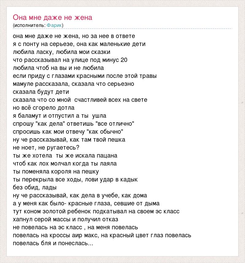она мне даже не жена, но за нее в ответе я с понту на серьезе, она как маленькие дети любила ласку, любила мои сказки что рассказывал на улице под минус 20 любила чтоб на вы и не любила если приду с глазами красными после этой травы мамуле рассказала, сказала что серьезно сказала будут дети сказала что со мной счастливей всех на свете но всё сгорело дотла я баламут и отпустил а ты ушла спрошу "как дела" ответишь "все отлично" спросишь как мои отвечу "как обычно" ну че рассказывай, как там твой пешка не ноет, не ругаетесь? ты же хотела ты же искала пацана чтоб как лох молчал когда ты лаяла ты поменяла короля на пешку ты перекрыла все ходы, лови удар в кадык без обид, лады ну че рассказывай, как дела в учебе, как дома а у меня как было- красные глаза, севшие от дыма тут коном золотой ребенок подкатывал на своем эс класс хапнул серой массы и получил отказ не повелась на эс класс , на меня повелась повелась на кроссы аир макс, на красный цвет глаз повелась повелась бля и понеслась...